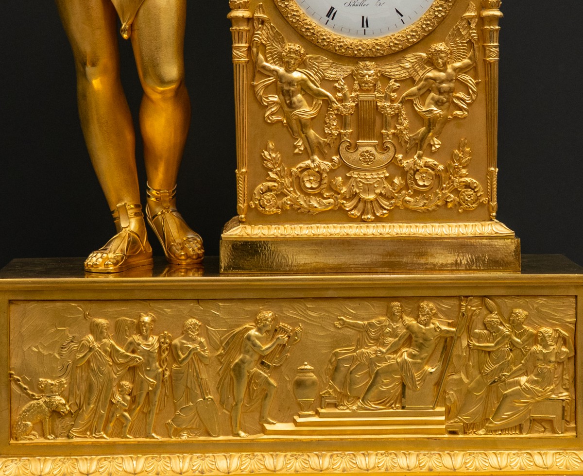 The model of Apollo standing beside the altar case derives from a composition by Pierre Philippe Thomire (1751 to 1843), appointed "ciseleur de l'Empereur" in 1809 and the leading Parisian bronzier of the Empire. The Orpheus and Eurydice relief and the winged lion bases belong to the decorative vocabulary that Thomire developed for his pendules à portique in the first years of the nineteenth century.