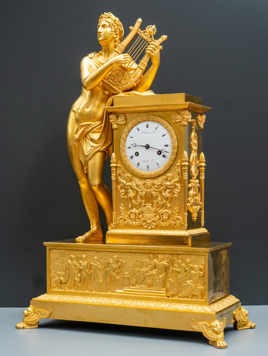 This important and finely chased Empire mantel clock depicts the god Apollo crowned with laurel, standing beside an altar like case and holding a loosely draped lyre. It is an exceptional and fully documented example of Parisian Empire clockmaking, carrying the joint signatures of two of the period's most significant bronziers, Claude François Rabiat and Pierre Chiboust, combined with a horological signature on the dial and a sculptural composition after a celebrated model by Pierre Philippe Thomire.