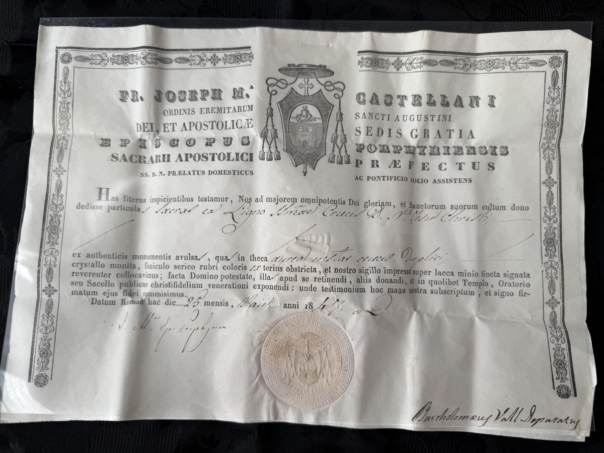 A real treasure! This reliquary crossin crystal and surrounded by finely chased gold, honors a relic of the Holy Cross. It is accompanied by its authentic dated May 25, 1847.but the certificate confirms that it is gold with the words "oréal". Here is a partial translation of the authentic: "FrèreJoseph M. Castellani,of the Order of Hermits of Saint Augustine, by the grace of God and the Apostolic SeeApostolic See, bishop of Porphyry, domestic prelate of His Holiness, prefect,assistant to the pontifical throne. Hereby certify that, for the greater glorythe greater glory of Almighty God and the worship of his saints, we havehave donated a parcel: "extracted from the wood of the True Cross of Our Lord Jesus Christ".Lord Jesus Christ".