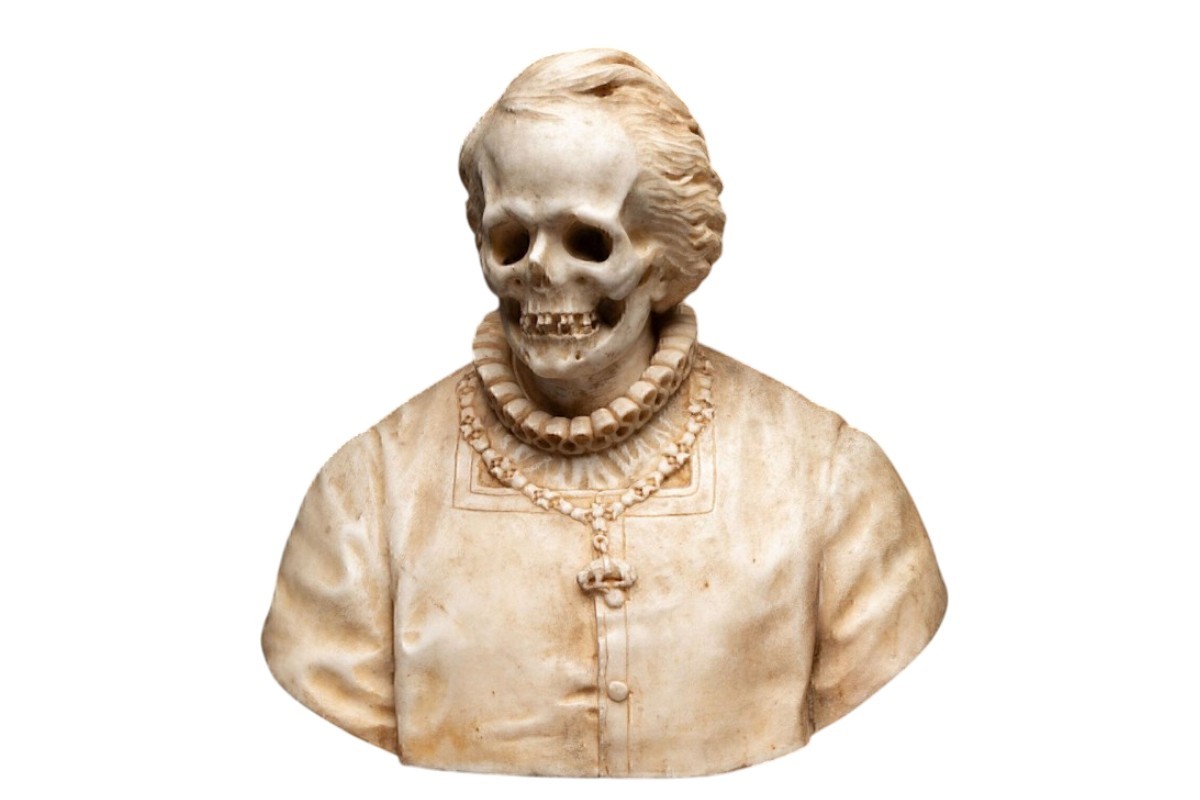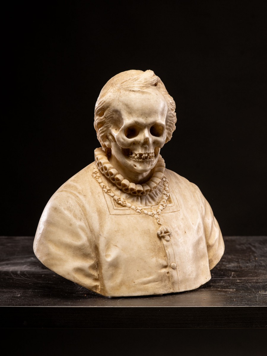 This marble bust unites worldly refinement and death in a single figure. The carefully carved costume and jewelry suggest social status and personal identity, while the skull replaces the living face. Such works belong to the tradition of vanitas or memento mori (“remember you must die”), intended to prompt reflection on the transience of life, wealth, and reputation.Comparable in meaning to Baroque vanitas still-life paintings—where skulls, timepieces, and extinguished candles symbolize mortality—this sculpture transforms those emblems into an embodied confrontation. Its modest scale suggests private contemplation, while the virtuosity of the carving intensifies the tension between permanence in stone and the inevitability of decay.Sculptural memento mori objects were produced in a range of materials and scales, from small devotional carvings to life-size skulls intended for study or contemplation. At 35 cm in height, this example likely functioned as a private object rather than a public monument, encouraging intimate reflection. The choice of marble underscores the paradox at the heart of the work: an enduring material employed to communicate impermanence.The technical finesse of the carving—softly modeled drapery, precise surface detailing, and anatomically legible bone—aligns the bust with the lingering Baroque taste. Rather than a purely macabre image, the sculpture serves as a philosophical reminder, confronting viewers with the tension between identity, time, and death.