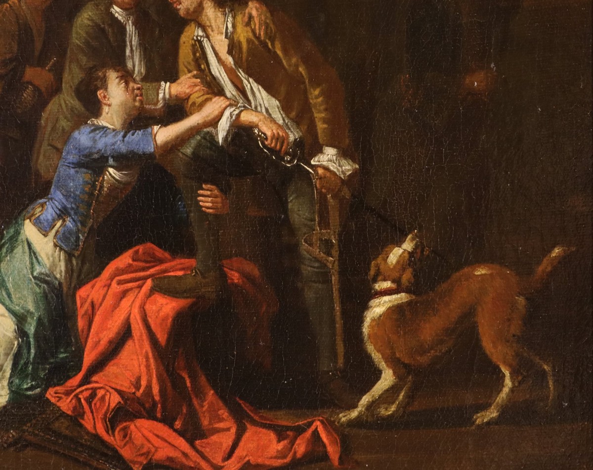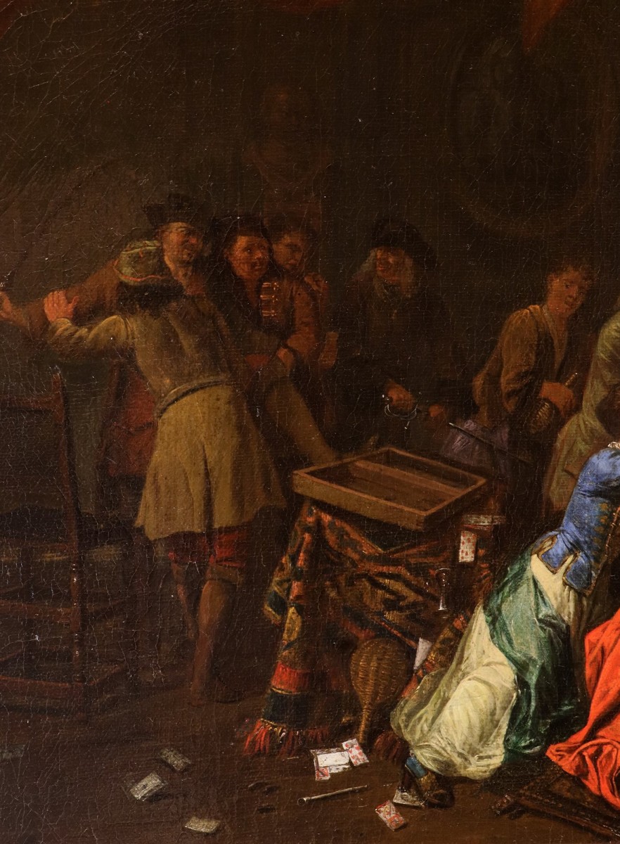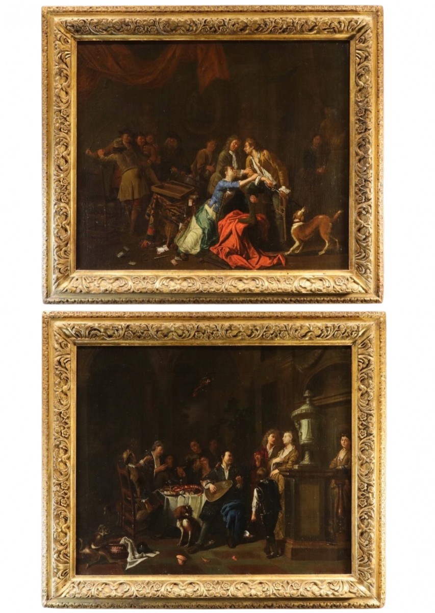 The lively and detailed scenes depicted in our pair of paintings, representing respectively a cheerful banquet and a brawl that broke out during a card game, bear the signature of Pieter Angillis (Dunkirk, 1685 – Rennes, Ille-et-Vilaine 1734) - 'P Angellis F(ecit)’,- a French/Flemish painter of the Baroque and Rococo periods, famous for his genre scenes and city markets.
