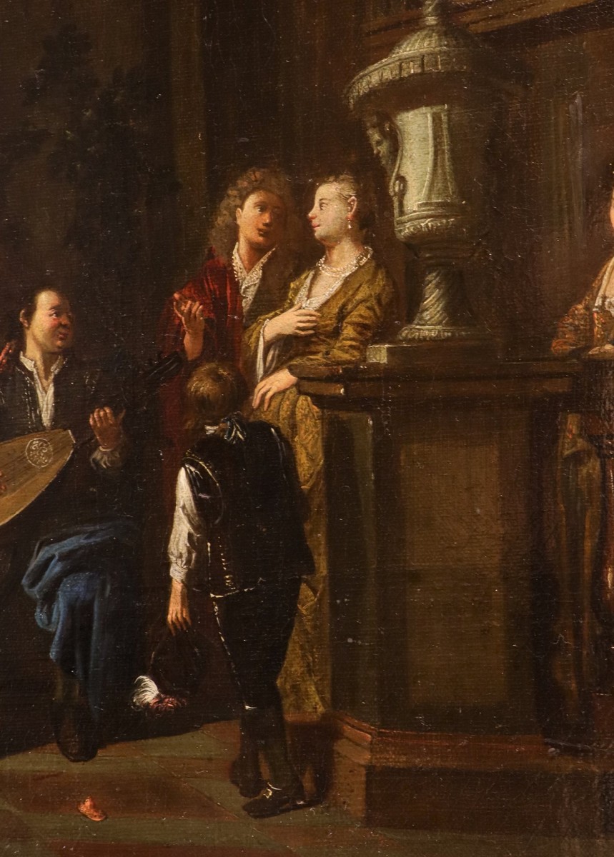 Looking more closely, in the first painting we are likely witnessing a banquet or a musical celebration, a typical subject of 18th-century Flemish art.