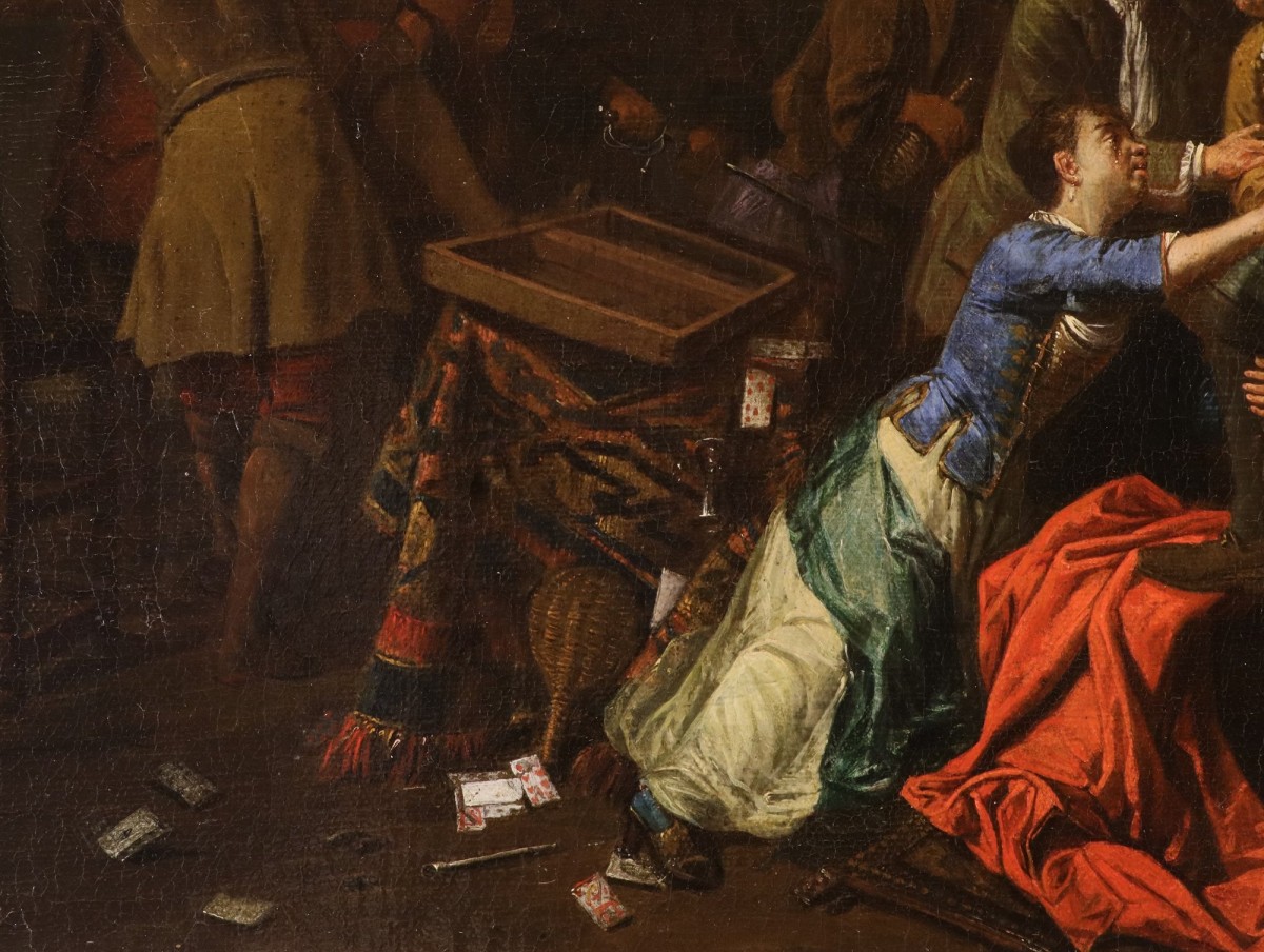 The second work, however, depicts the turmoil of a brawl between two male figures, likely arising during or after a card game—another common theme in genre painting of the era used to represent bourgeois or working-class life.