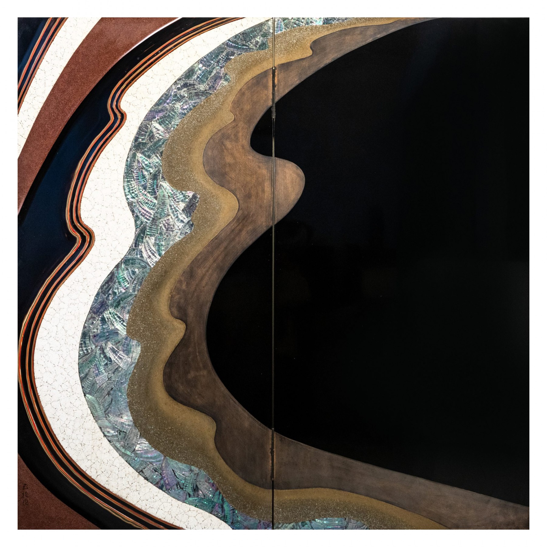 A contemporary Japanese two-panel folding screen decorated in lacquer with a stylized depiction of a large wave reflecting sunlight, signed Gyokuh? saku. The surface is articulated by broad undulating forms that evoke the movement of water, executed in polychrome lacquer in relief. The title of the work, “Hohoe,” is indicated on the tomobako.