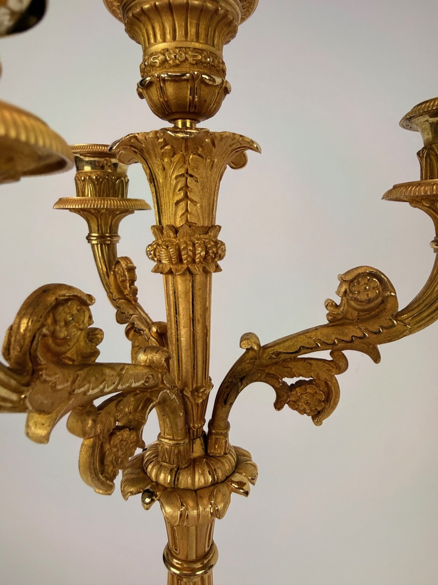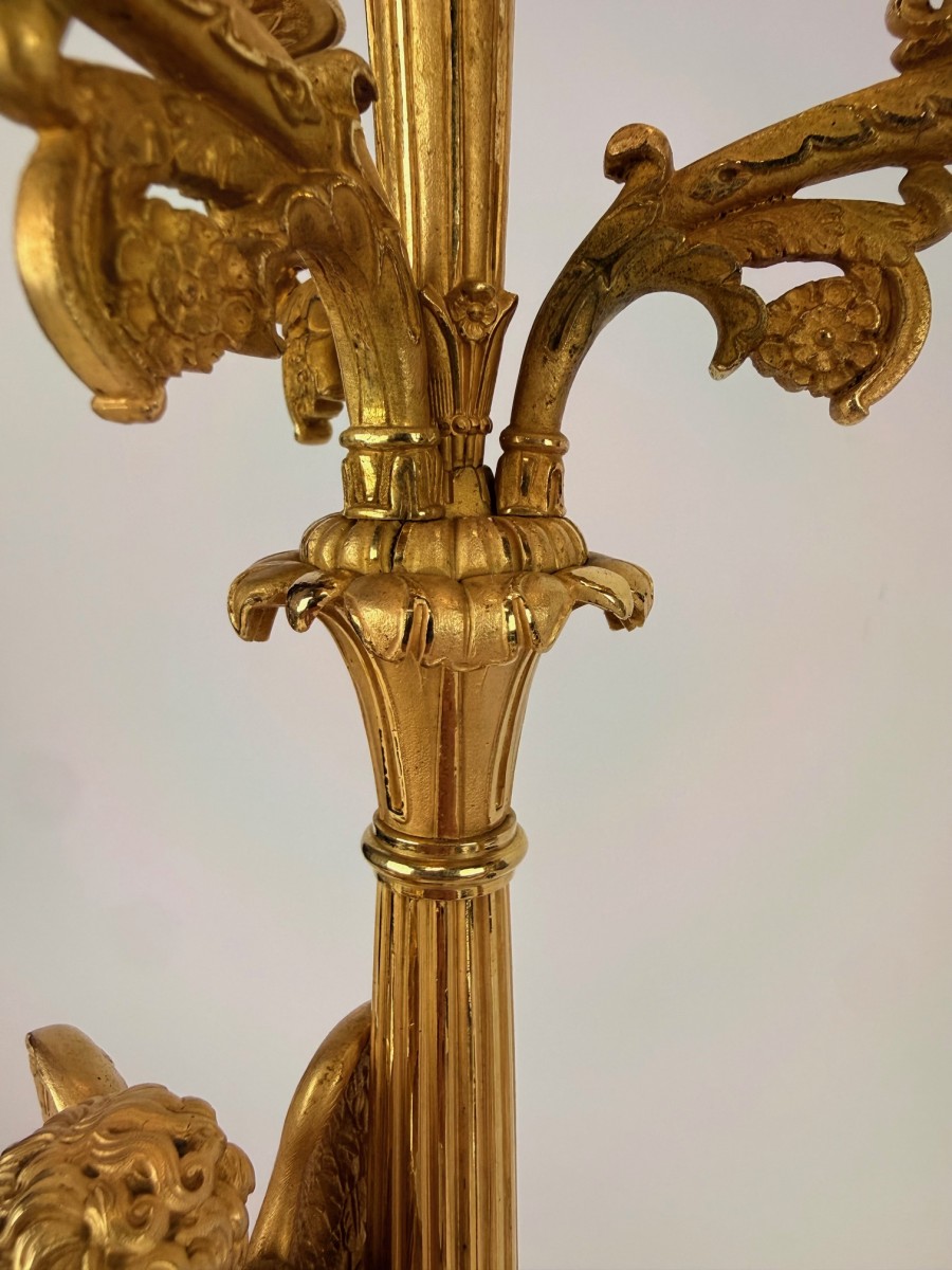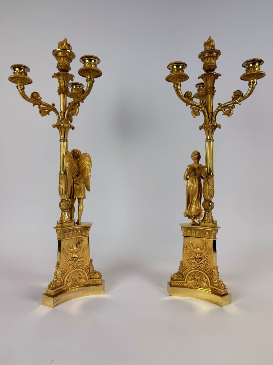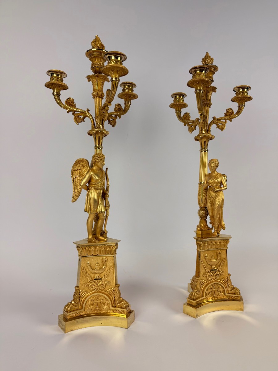 Pair of Fine Gilt Empire Candelabra, Early 19th Century A superb pair of French Empire-style gilt bronzecandelabra, richly ornamented and finely cast, dating to the early 19thcentury. Each candelabrum is designed with three scrolling candle arms arrangedaround a central fluted stem, surmounted by a flame-form finial. The stems are supported by elegantly modeled classicalfigures: one depicting a winged male youth (likely Cupid or Eros) holding abow, and the other a draped female figure in the manner of a classical muse orgoddess. Both figures stand gracefully upon stepped pedestals. The bases are of architectural form, decorated in highrelief with neoclassical motifs including an antique oil lamp, laurel wreaths,crossed elements, and stylized ram heads, all symbolizing victory,enlightenment, and classical antiquity—hallmarks of the Empire period. The original fire-gilding (ormolu) retains a warm, rich patina, highlighting the exceptional quality of the chasing and detailthroughout. Condition: Very good antique condition with minor wearconsistent with age and use. Origin: FrancePeriod: Empire, circa 1800–1820 Dimensions: H57,5 x W20 x D18cm. H22,63 x W7,87 x D7,09 inch