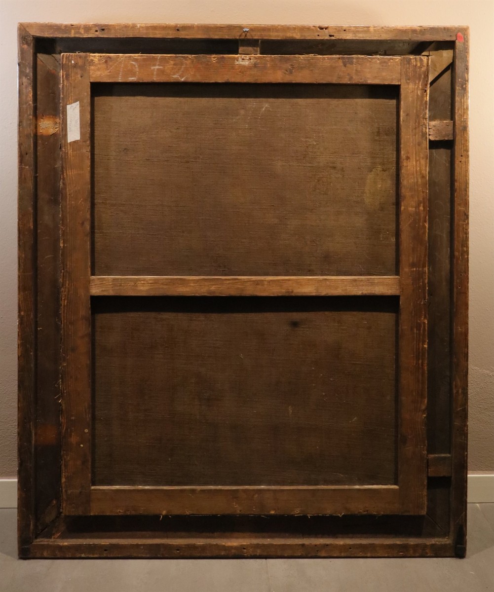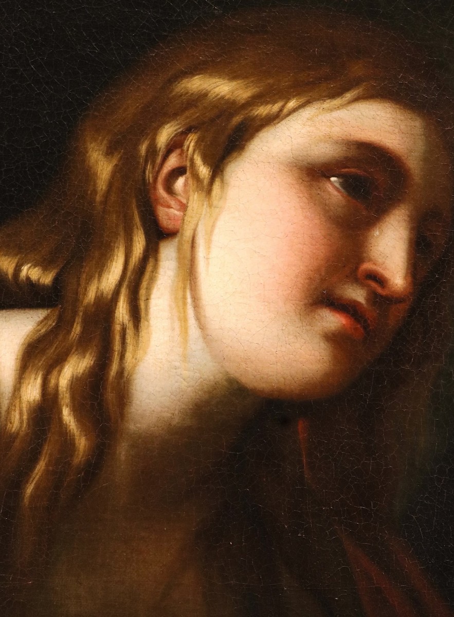Returning to our painting, we are therefore inclined to attribute its execution to a skilled Baroque painter active in the 17th century, specifically a follower or pupil of Guido Reni, whose workshop produced numerous depictions of the Penitent Magdalene; among these are the famous painting in Palazzo Barberini and the one in the Quimper Musée des Beaux-Arts,, both by Reni himself, or the Penitent Mary Magdalene attributed to Giovan Gioseffo Dal Sole Palazzo Pellegrini a S. Cecilia, Verona, , and finally, Saint Mary Magdalene in Adoration of the Crucifix by Luca Ferrari, also a pupil of Reni (formerly in the collection of Prince R. Pignatelli,