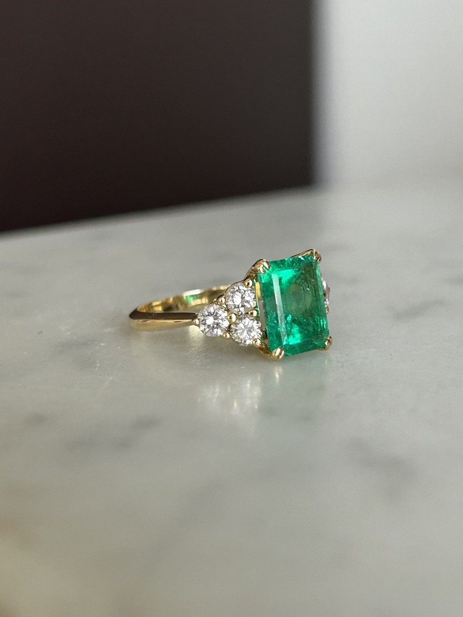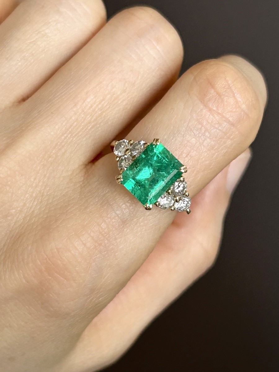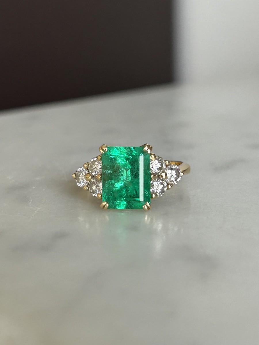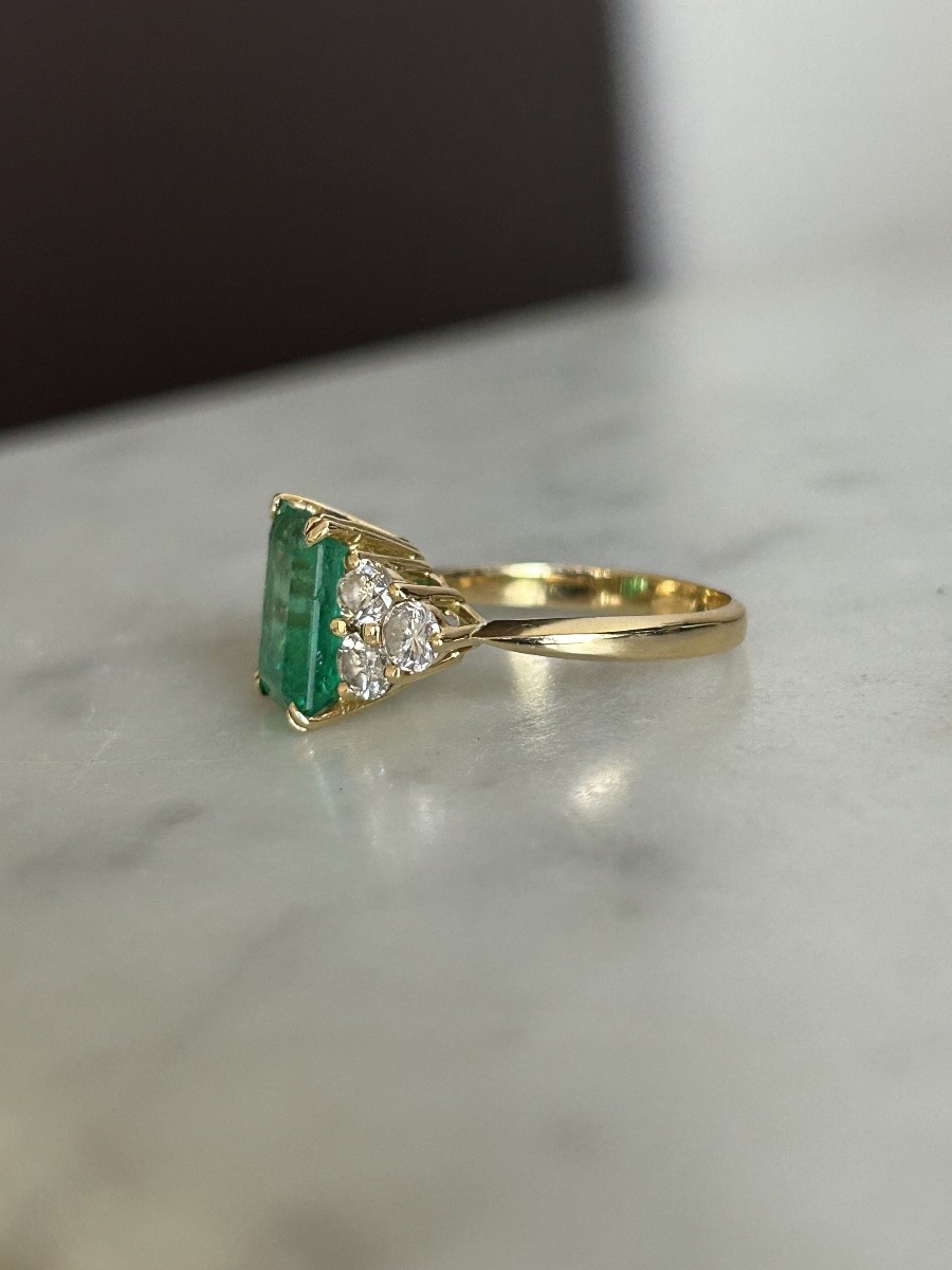 18K yellow gold ring set with an intense green Colombian emerald octagonal size weighing approximately 3.02 ct.