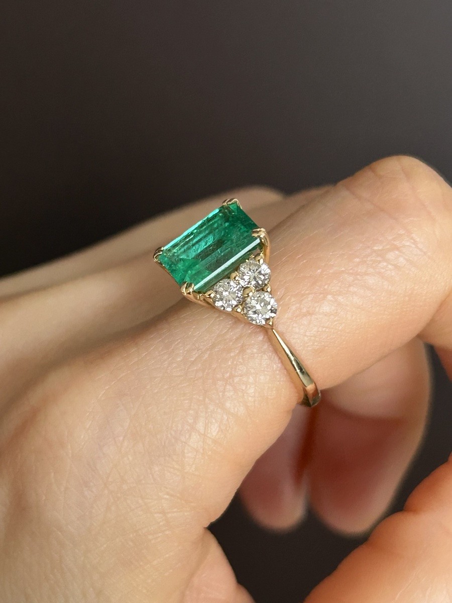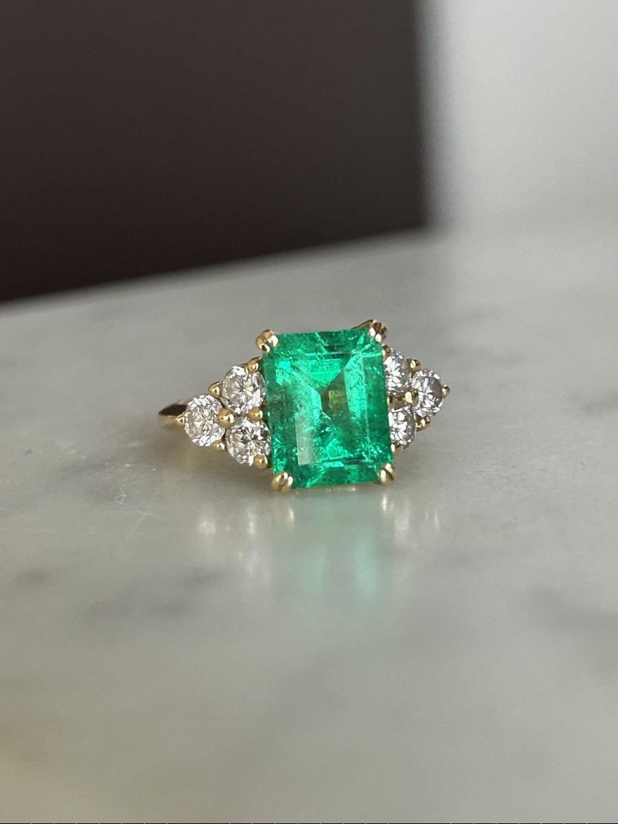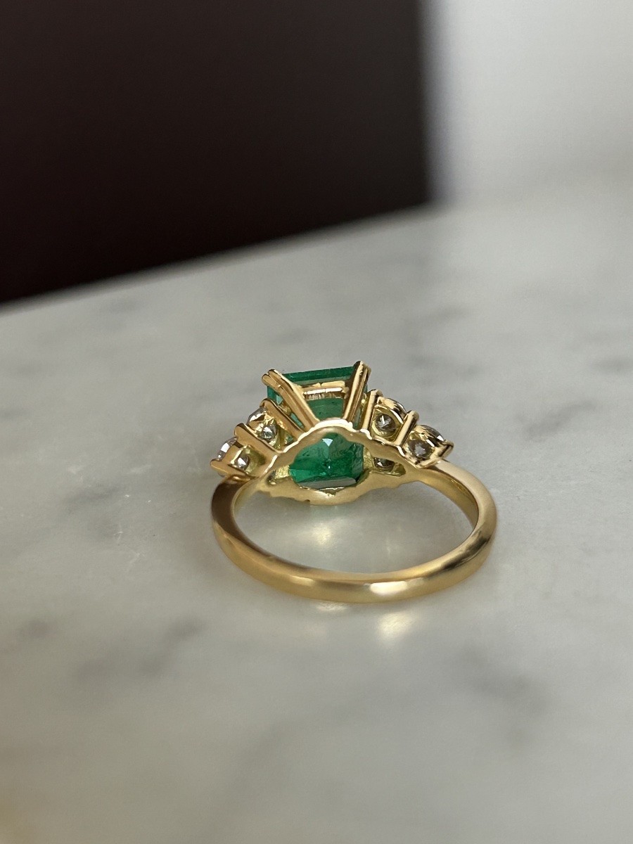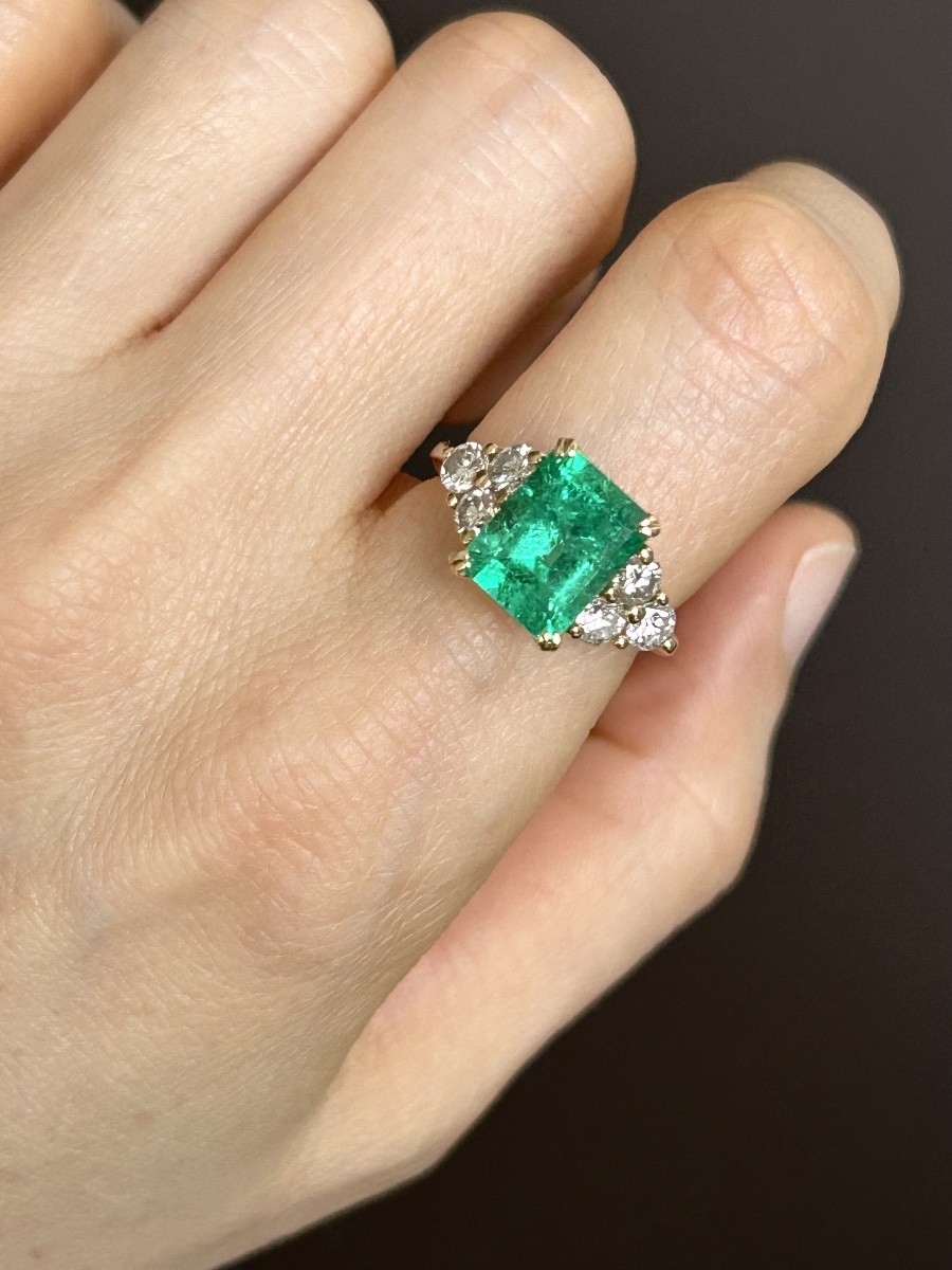 18K yellow gold ring set with an intense green Colombian emerald octagonal size weighing approximately 3.02 ct.