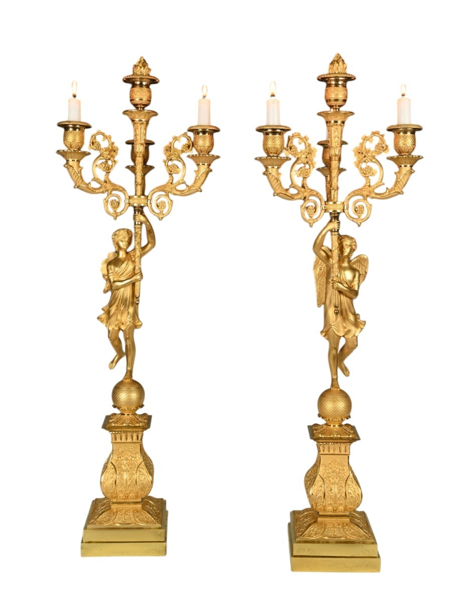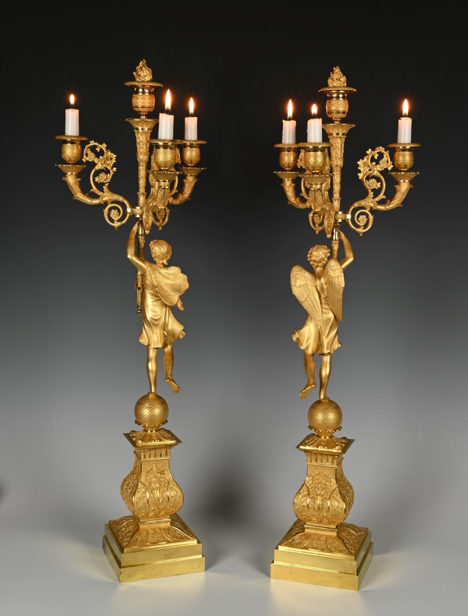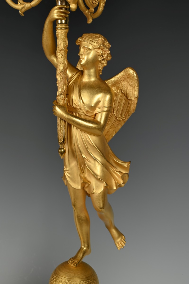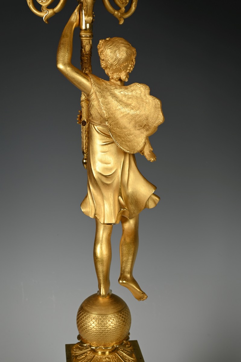 The candle arms are supported by a torch wrapped with leafy vines in the hand of a Bacchante, one with a folded animal skin and a garland of grapes in its hair, the other with wings.
