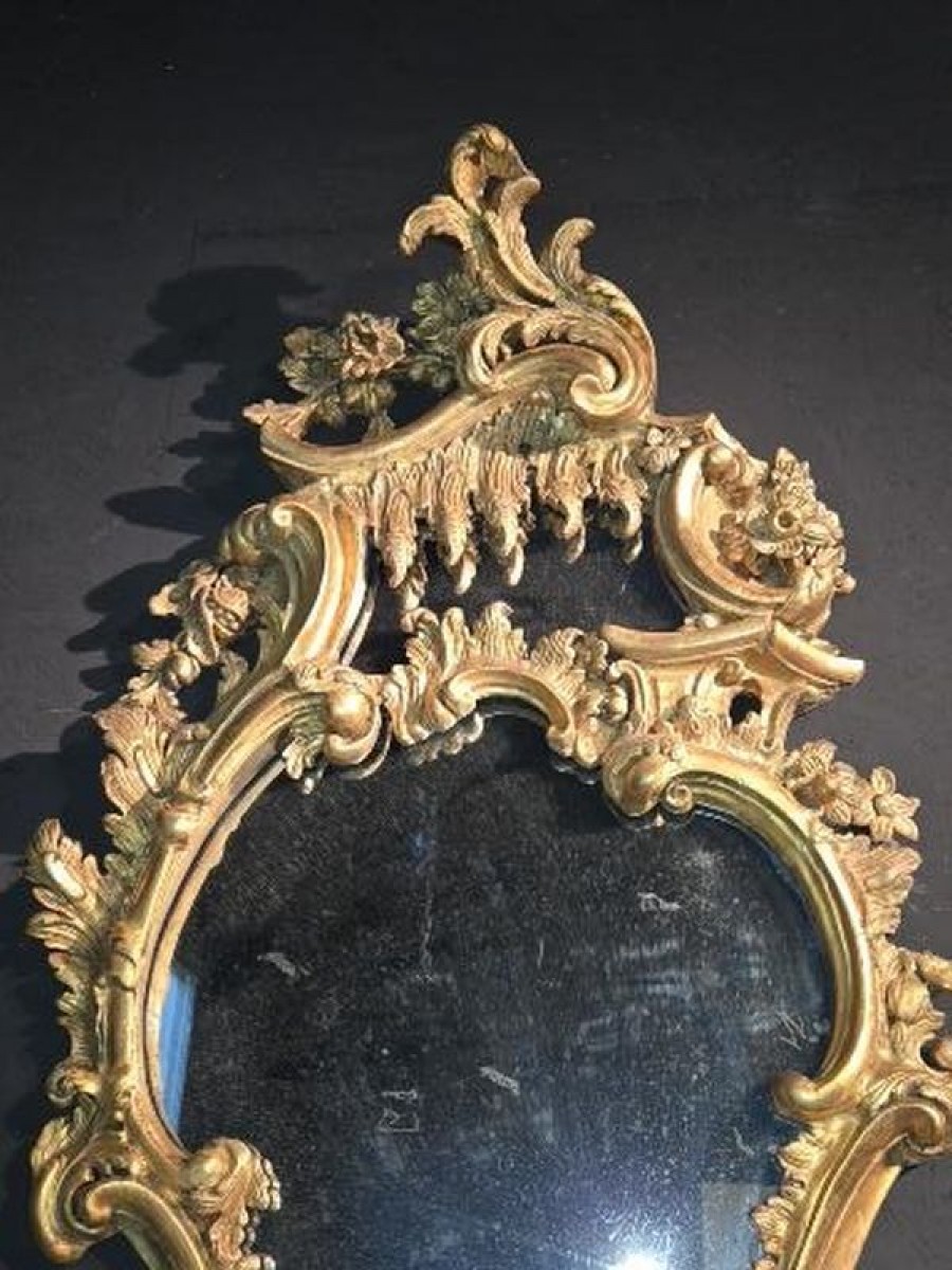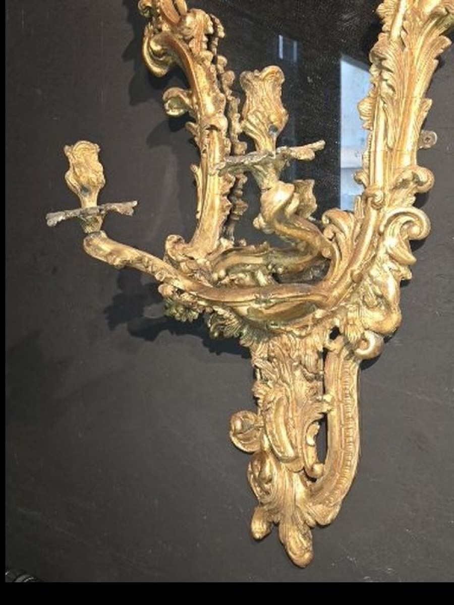 The mirrors feature a magnificent asymmetrical design, embellished with rocaille motifs, shell ornaments and scrolls. The candlesticks, in gilded lead, are highly worked.