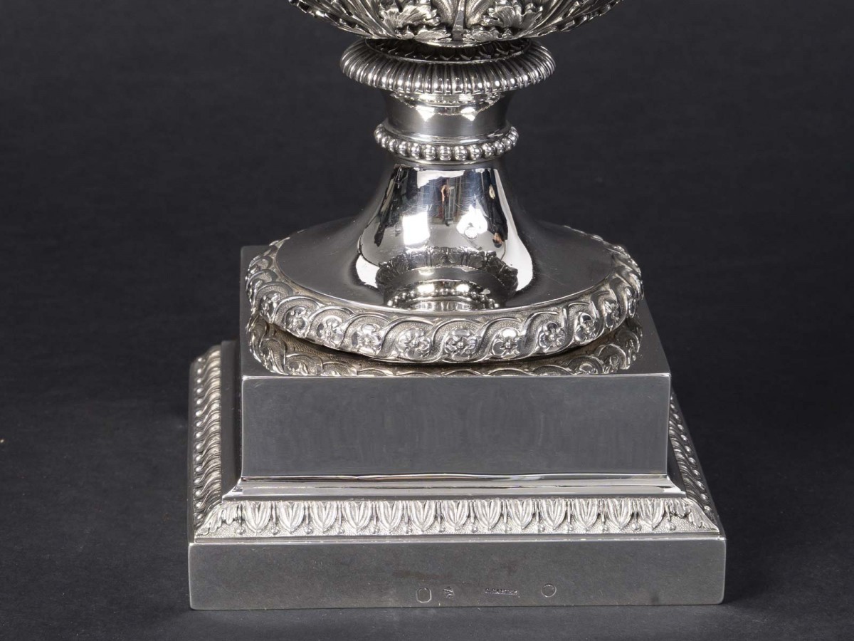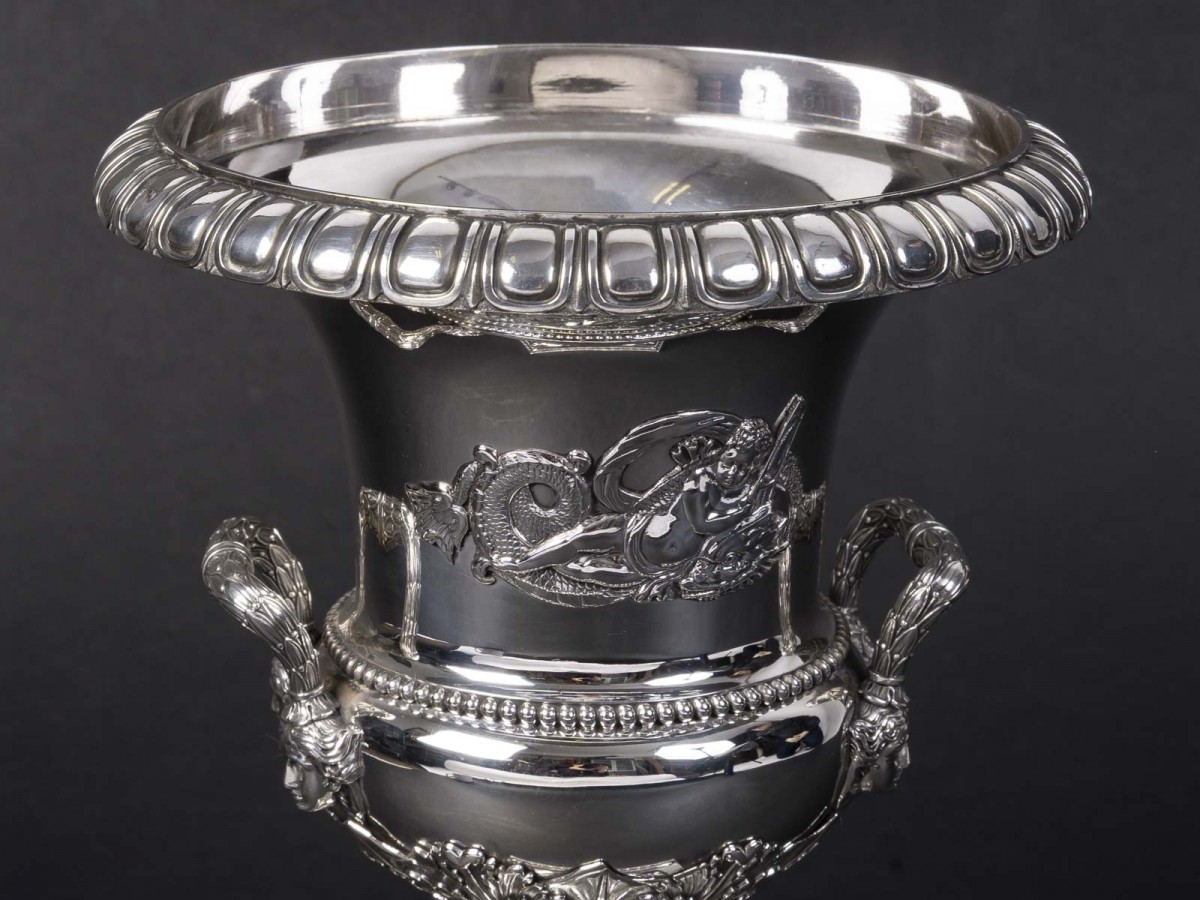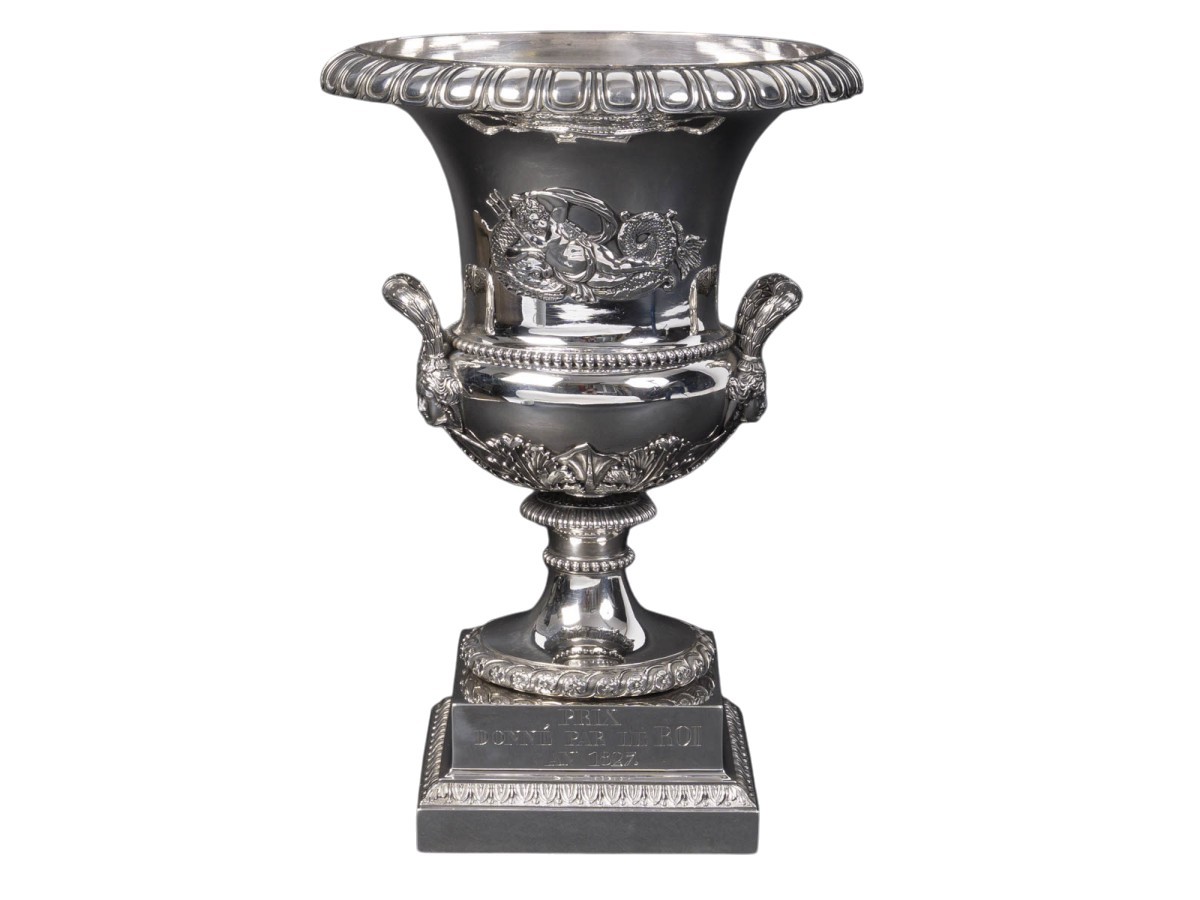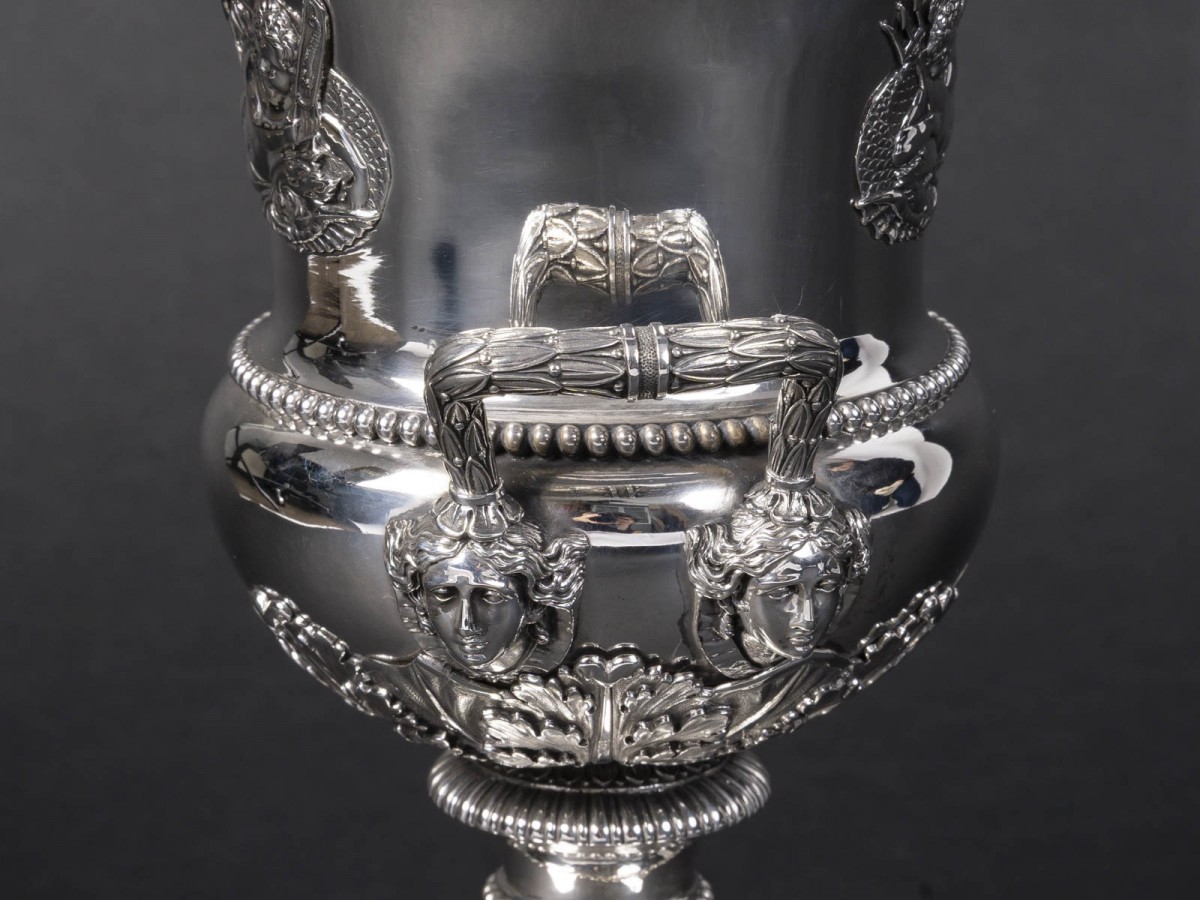 Jean-Charles CAHIER (1772 - 1849) TROPHY In silver, in the form of a Medici vase, the two sides of the neck are decorated with allegorical figures of Neptune, the handles with palmette decoration are surmounted by female heads, and the body is adorned with acanthus leaves.