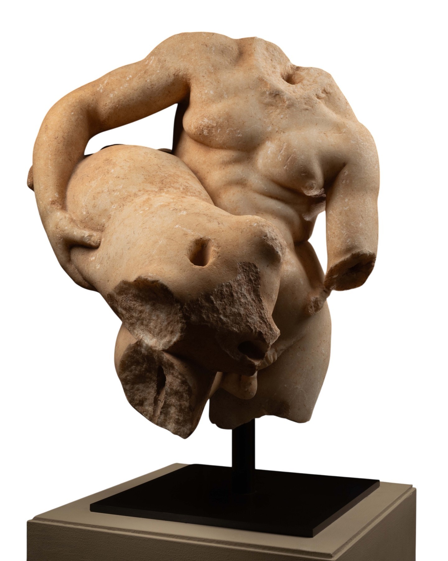 Numerous examples of such re-use can be cited, including Villa Doria Pamphilj, Villa Albani, Villa Torlonia, Villa Borghese, Palazzo Caffarelli, Newby Hall, and the Staatliche Kunstsammlungen Dresden, to name a few. The presence of multiple holes in the sculpture indicates subsequent modifications, likely for the insertion of iron rods to secure additional elements. These could represent either ancient or more modern restorations, reflecting a practice not uncommon in both late antiquity and the Renaissance.