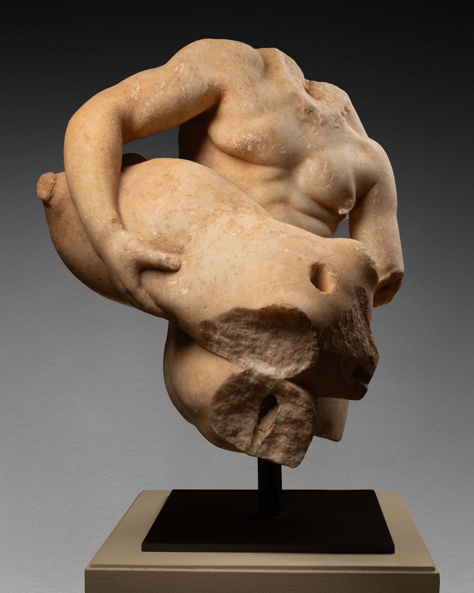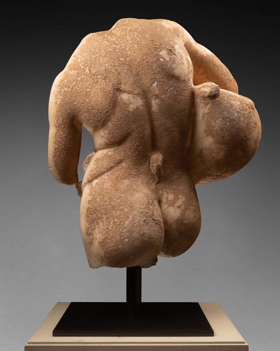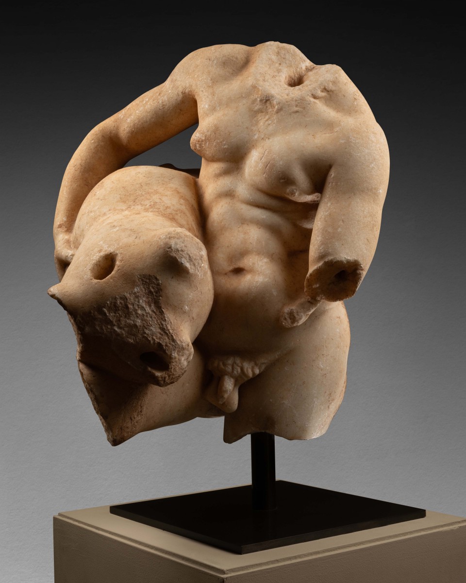 The torso before us represents one of the most prevalent and favoured sculptural motifs among the wealthy families of the Roman ruling class. The depiction of Silenus with a wineskin—commonly referred to as culleus in Latin—directly references sculptures associated with the Dionysian sphere, a well-recognised and esteemed theme in the imperial world. Although carved from Greek white marble, it cannot be ruled out that the statue may have been crafted in a workshop in Rome itself.