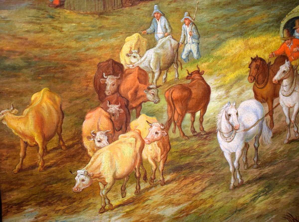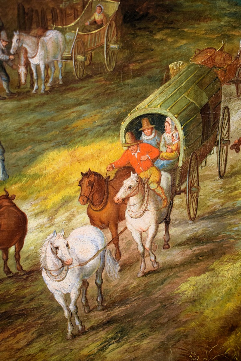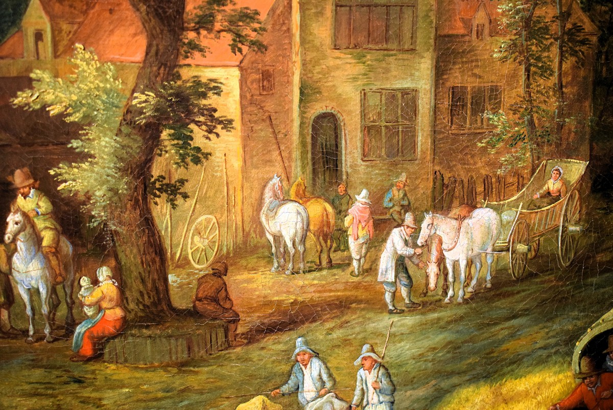 The simple and spontaneous joy of life of the peasants is depicted in a fairytale-like and sometimes grotesque manner, using bold colors typical of the Flemish Baroque, as can be seen in the pair of landscapes presented here.