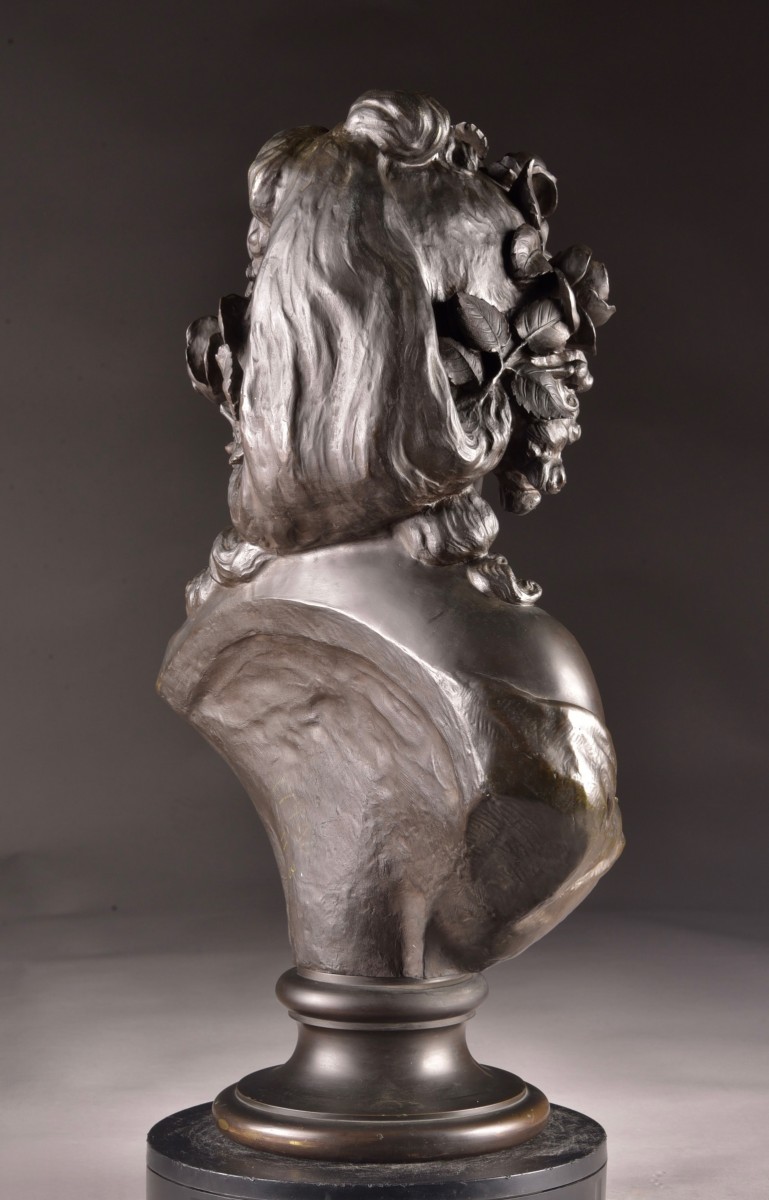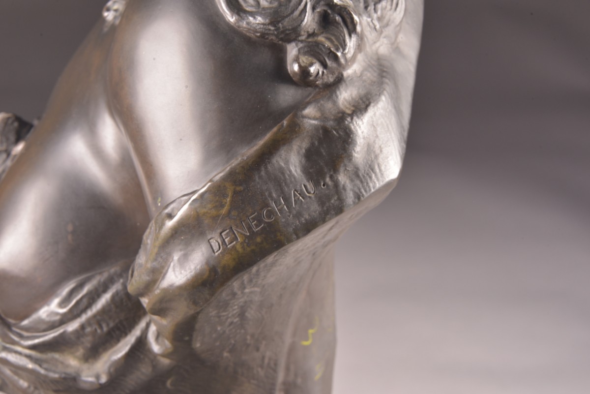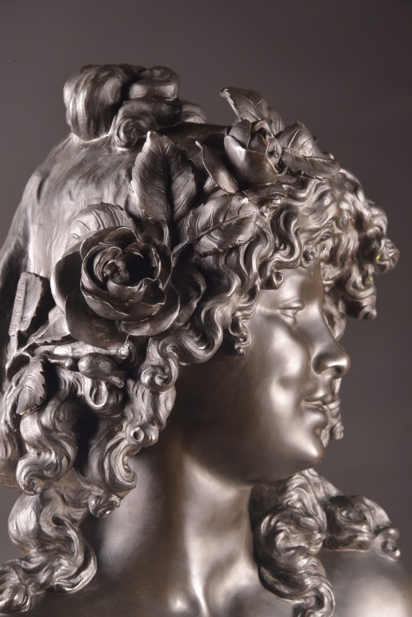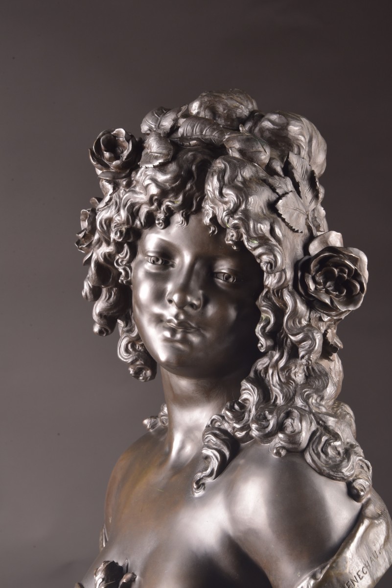 This refined sculpture depicts a young woman adorned with abundant curly hair embellished with roses, evoking the sensual, poetic imagery typical of Bacchic figures. The slight inclination of the head and the serene expression convey a gentle interiority, while the finesse of the modeling reflects the academic tradition of late 19th-century French sculpture. The composition is distinguished by its harmonious balance and naturalistic treatment of form. The partially draped bust, combined with the floral motif, underscores the subtle interplay between modesty and sensuality, a theme characteristic of the decorative arts of the Belle Époque. The bronze has a rich, nuanced patina, highlighting the delicate variations of light on the surface and underscoring the sculptor's attention to detail, particularly in the treatment of hair and drapery. Both decorative and sculptural, this work aptly illustrates the elegance and refinement of French workshop production at the turn of the century. Signature: Denechau