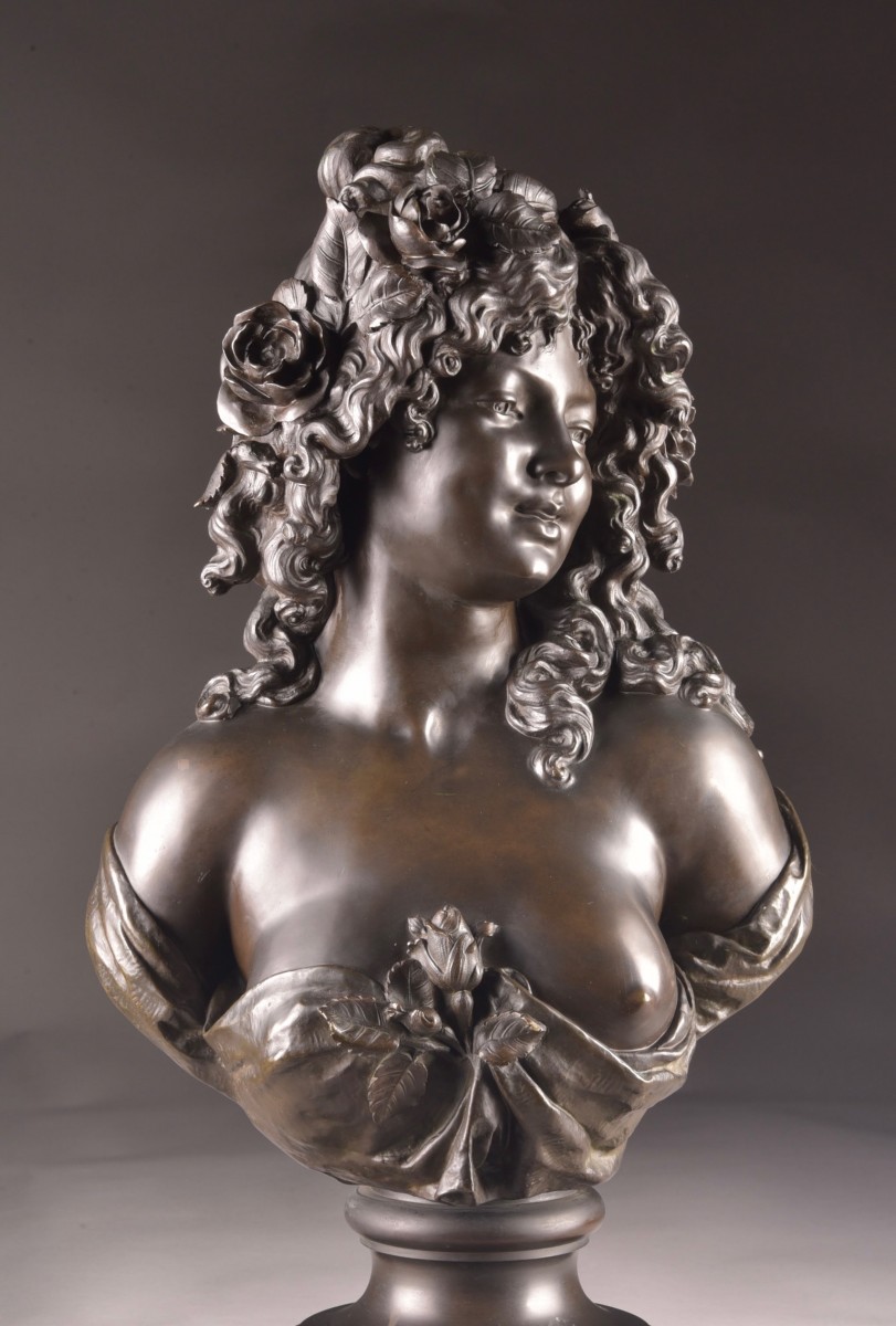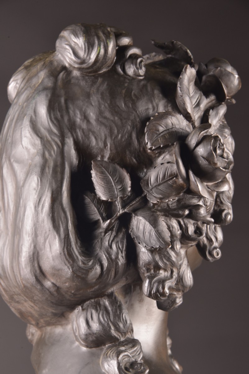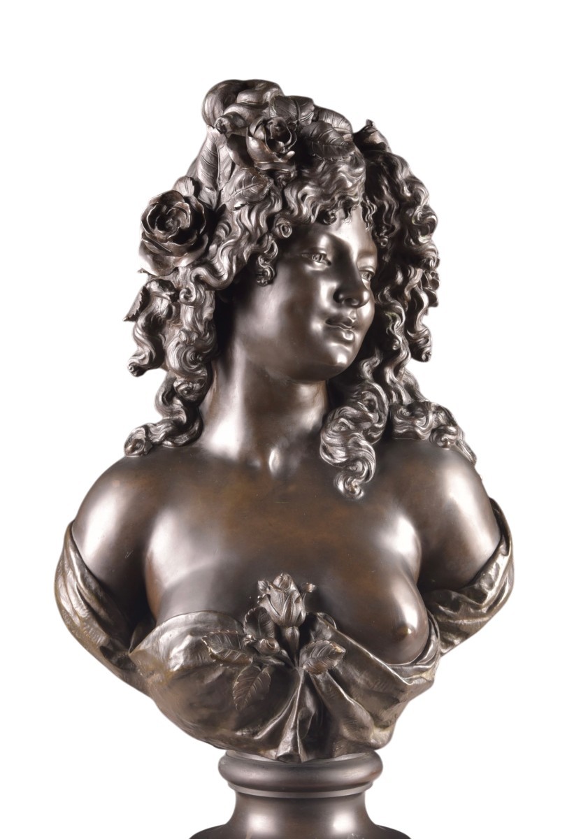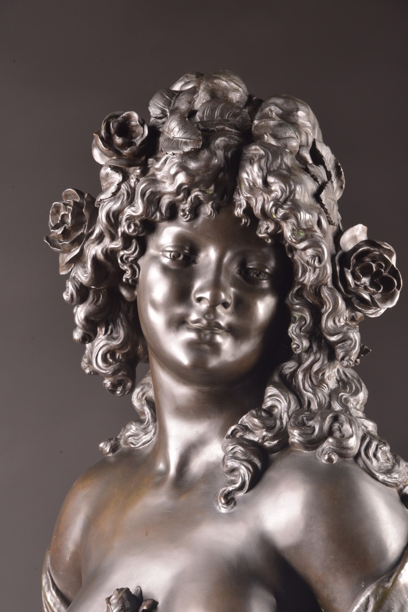 This refined sculpture depicts a young woman adorned with abundant curly hair embellished with roses, evoking the sensual, poetic imagery typical of Bacchic figures. The slight inclination of the head and the serene expression convey a gentle interiority, while the finesse of the modeling reflects the academic tradition of late 19th-century French sculpture. The composition is distinguished by its harmonious balance and naturalistic treatment of form. The partially draped bust, combined with the floral motif, underscores the subtle interplay between modesty and sensuality, a theme characteristic of the decorative arts of the Belle Époque. The bronze has a rich, nuanced patina, highlighting the delicate variations of light on the surface and underscoring the sculptor's attention to detail, particularly in the treatment of hair and drapery. Both decorative and sculptural, this work aptly illustrates the elegance and refinement of French workshop production at the turn of the century. Signature: Denechau