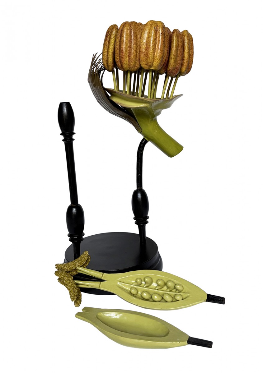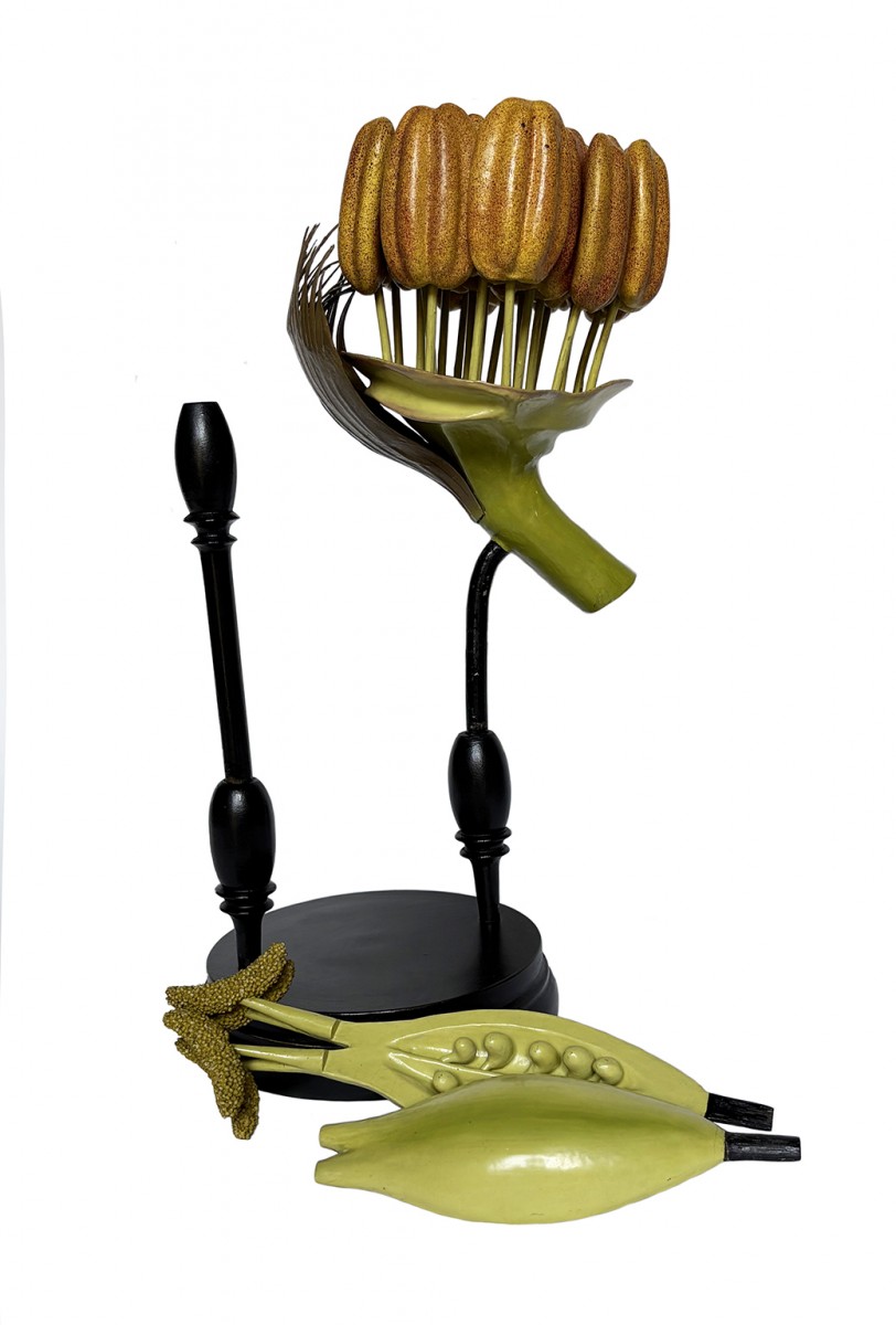 Papier-mâché, plaster, wood, and small hand-painted stones.