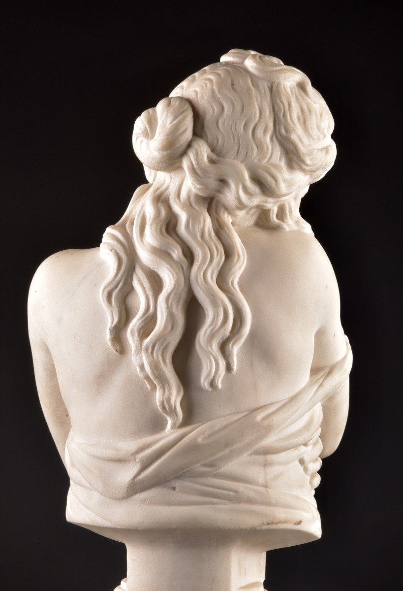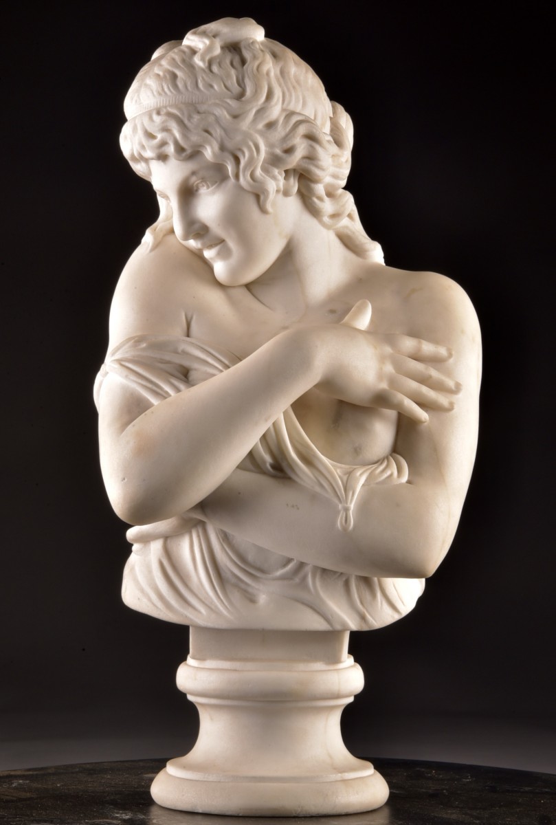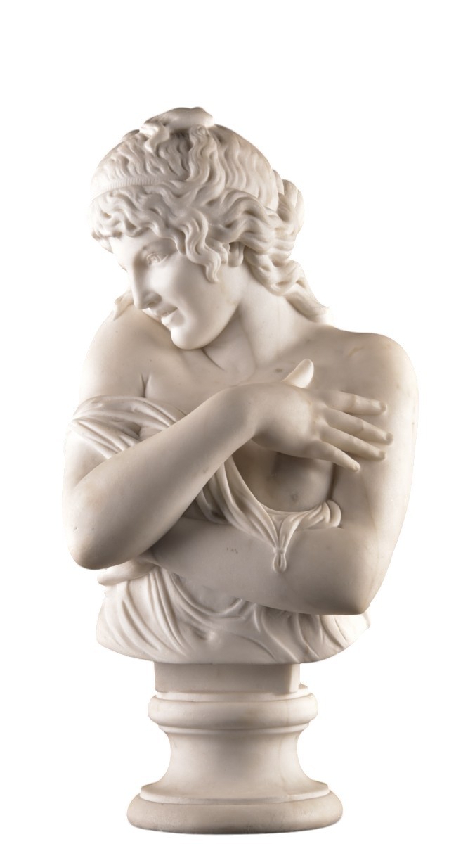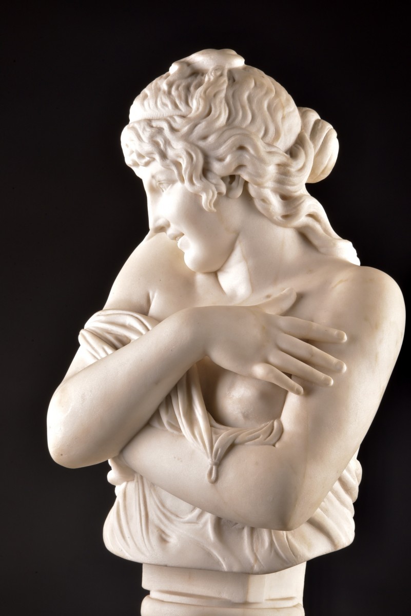 Elegant marble bust of a young woman Executed in a refined neoclassical style. The figure is depicted in a graceful and introspective pose, gently embracing her shoulders with a softly draped garment. The subtle expression and finely sculpted facial features reflect a high level of craftsmanship. The delicately rendered hair and harmonious proportions enhance the sense of serenity and intimacy.