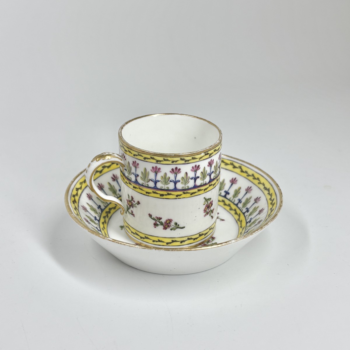 Cup and saucer in soft-paste Sèvres porcelain (3rd size) decorated in polychrome with three concentric bands on a yellow ground surrounding flowering stems and scattered flowers. Gold rim.