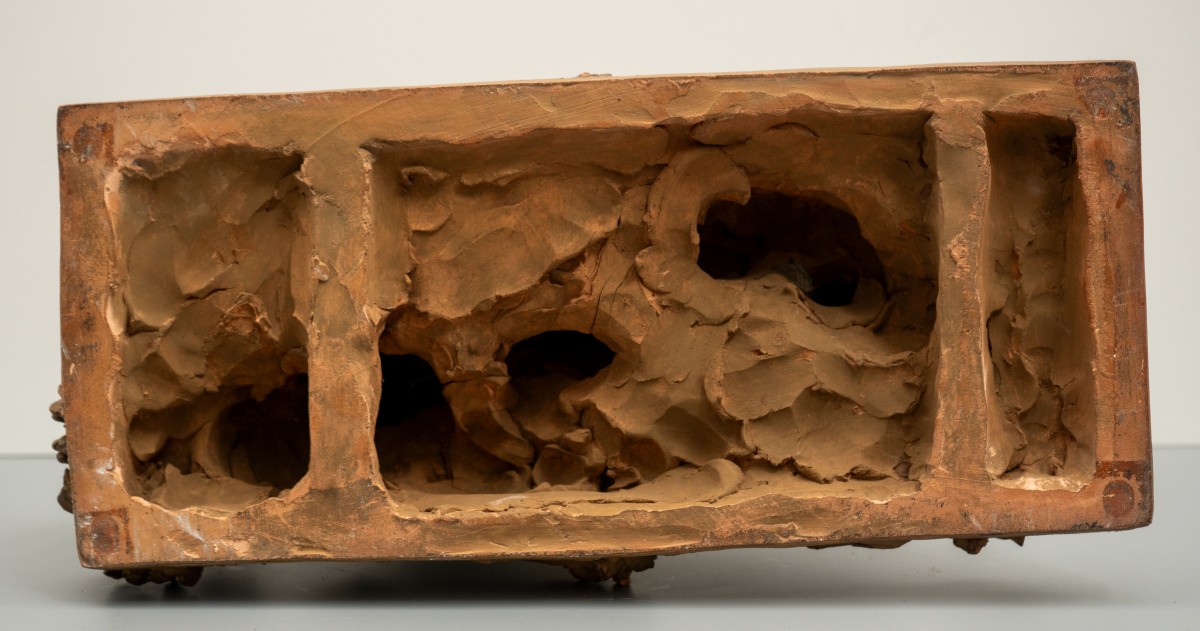 The modelling is of outstanding quality throughout. The drapery is deeply worked with incised folds, fringed borders and floral rosette ties, while the floral passages — more elaborate than those on the closely related version in The David Collection, Copenhagen (inv. B 468) — display a virtuosity of hand entirely consistent with autograph execution. The child's face is rendered with striking individual characterisation. The hollow construction, visible through the open base, is entirely consistent with high-quality French atelier practice of the Louis XVI period, the interior retaining original finger and tool marks. The warm reddish-brown clay body is unretouched throughout, without later paint or wash.