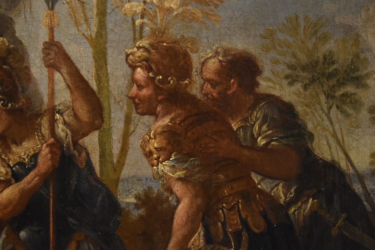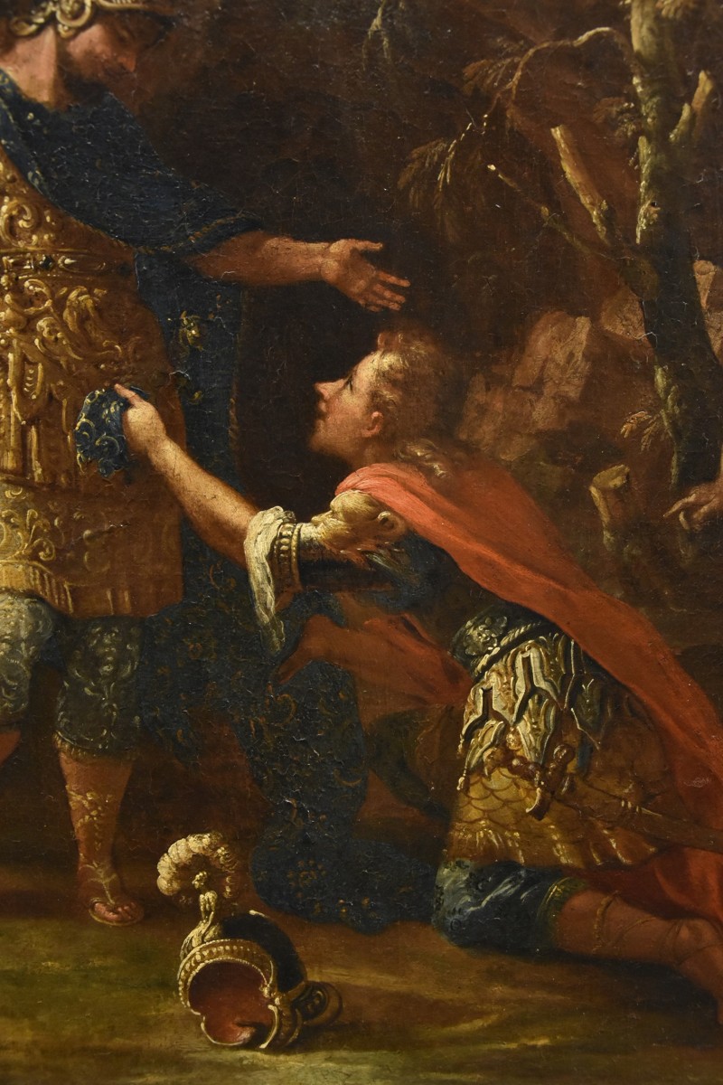 In this work, Fontebasso presents us with a piece that is deeply emotionally engaging, both for the magnificence of the painting and for the subject matter. The subject, in fact, reveals the magnanimity and clemency of the sovereign, who often treated his conquered enemies with the utmost respect.