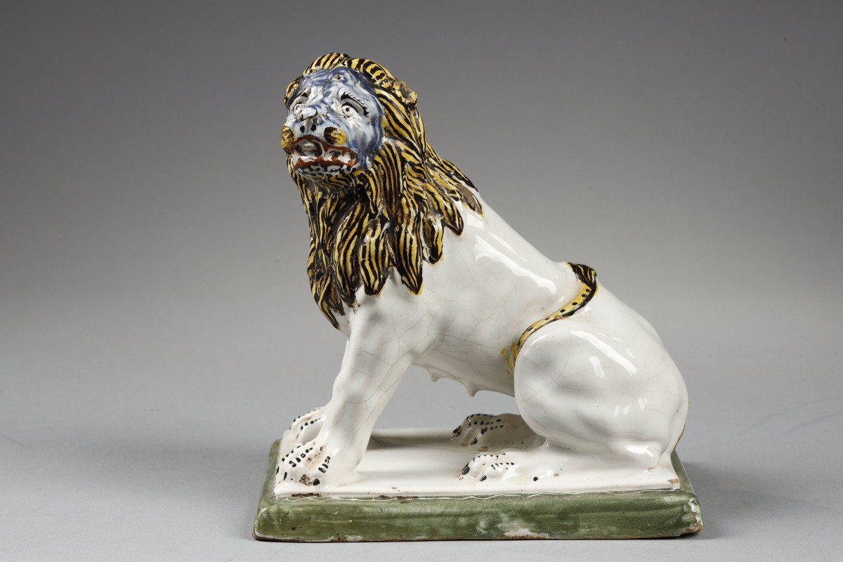 Rouen: faience lioness seated on a small mound, the mane painted in yellow and manganese, the mouth painted in blue. First third of the 18th century.