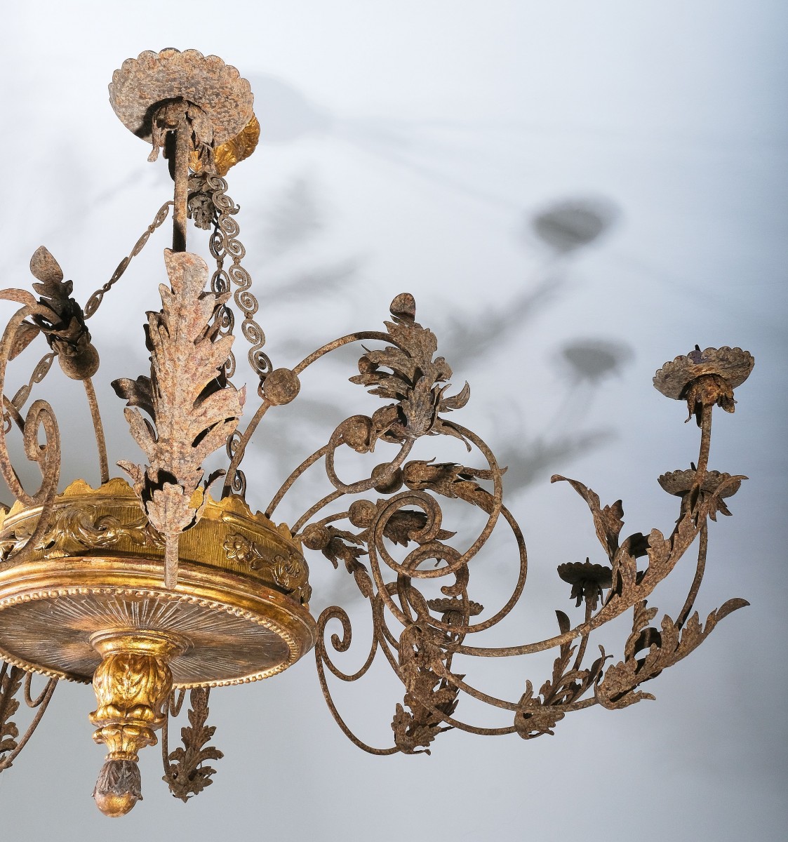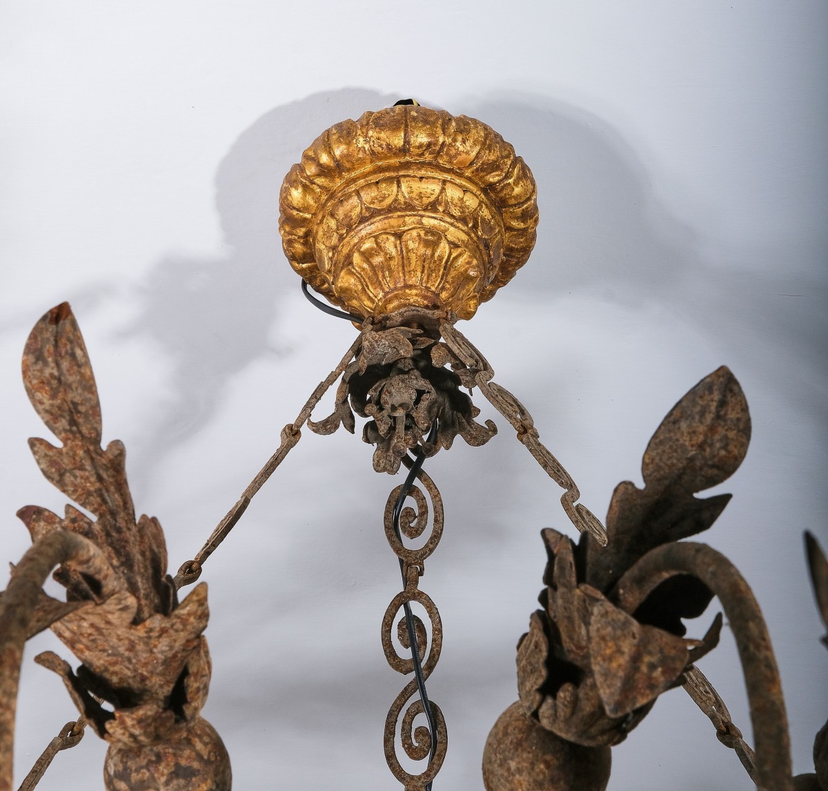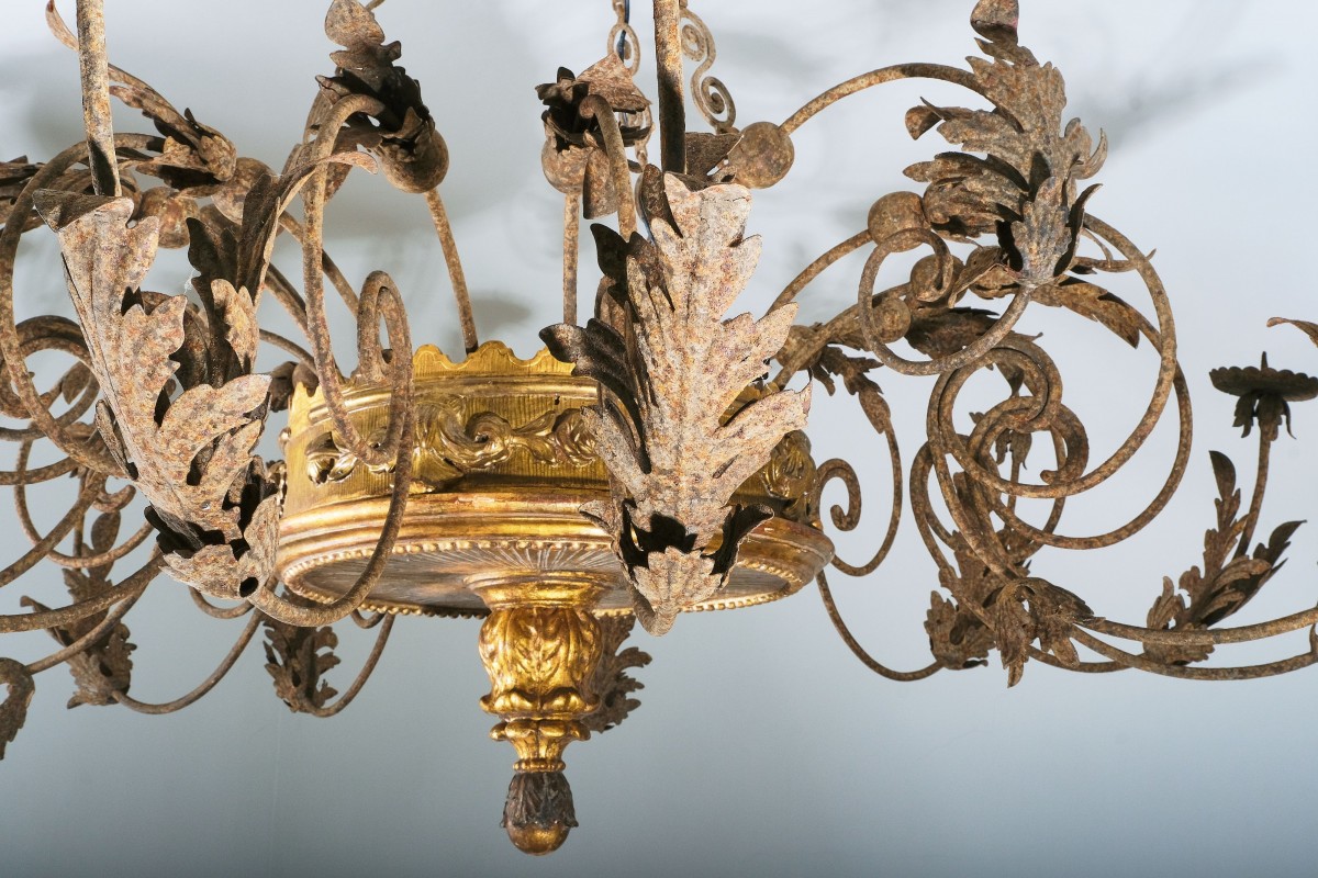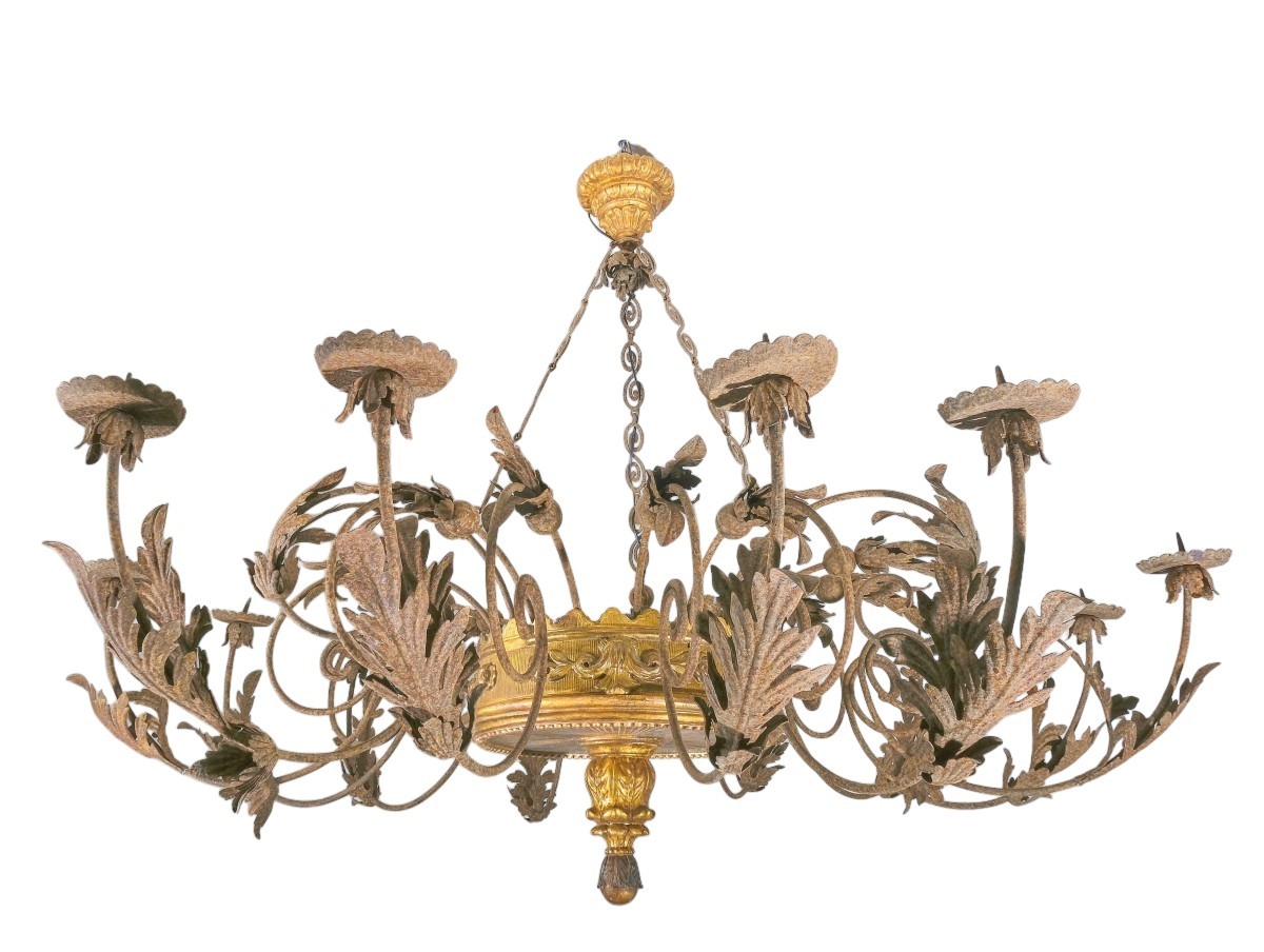 Impressive Italian Baroque chandelier with twelve branches. The central stem and crown are in carved wood, while the branches and chains are in wrought iron. This chandelier has never been electrified.