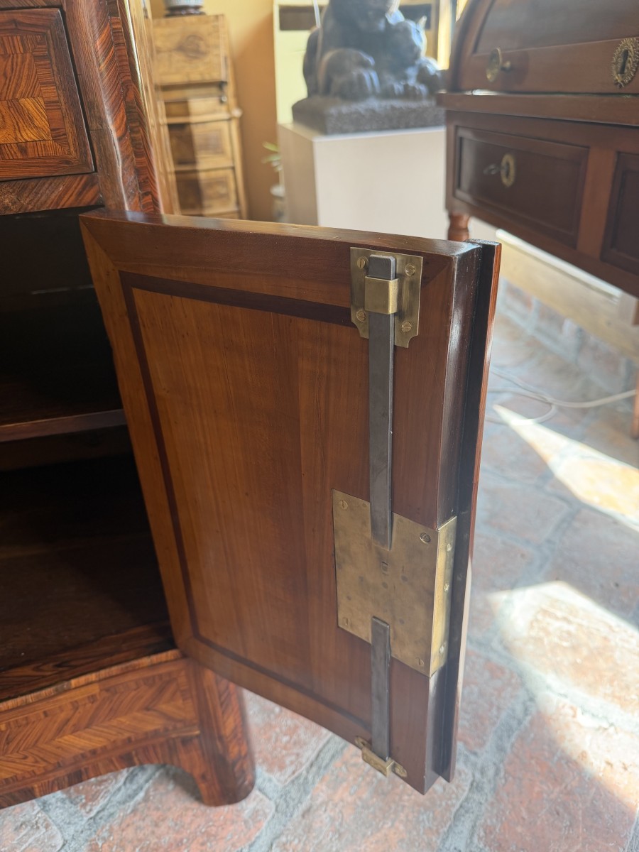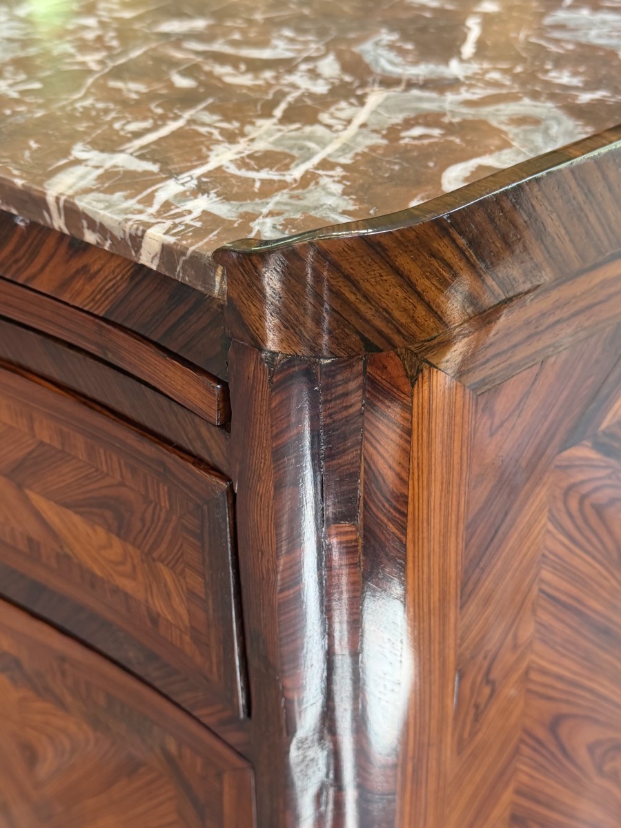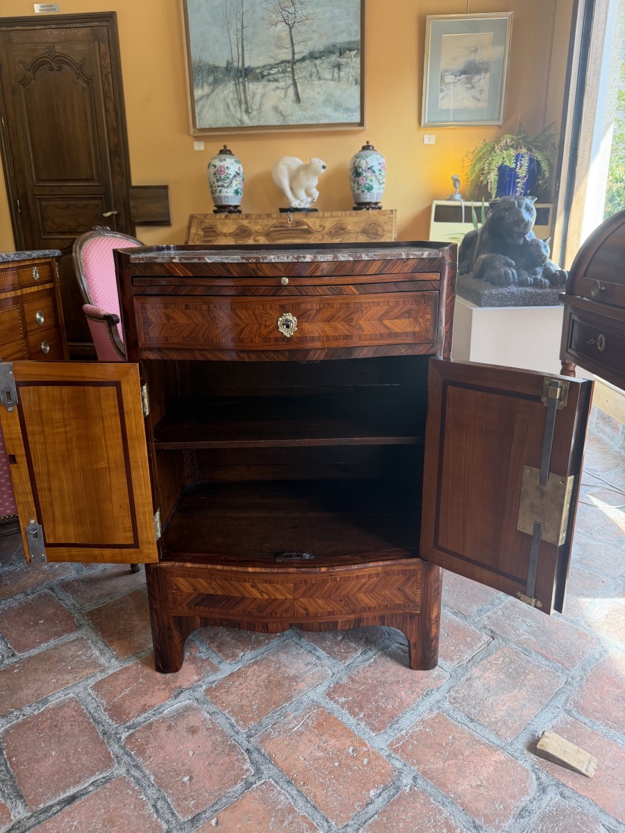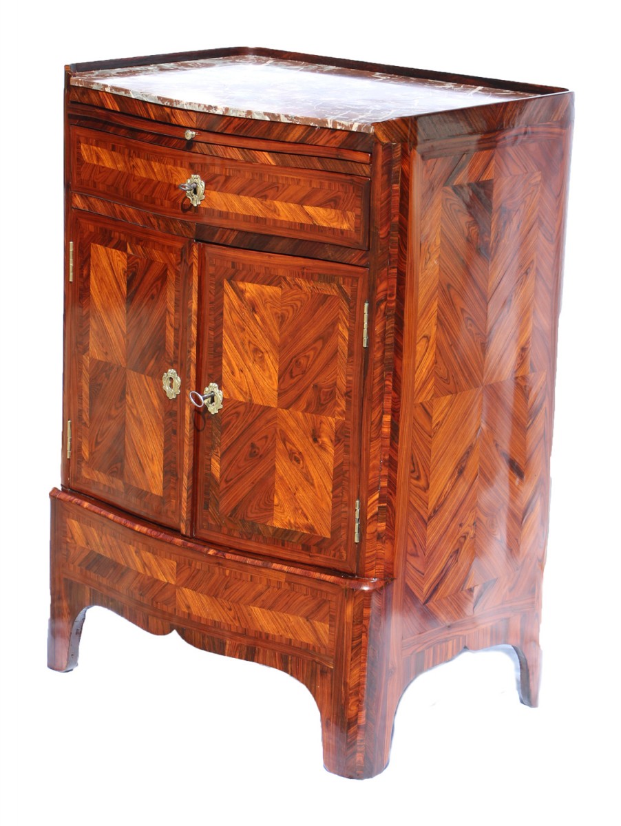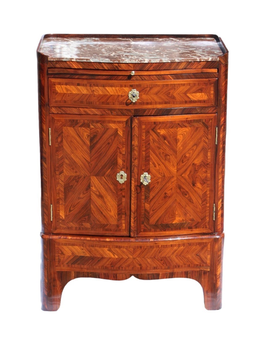 Small violet wood and rosewood veneered "entre-deux" cabinet opening to a drawer in the waistband, a leather-covered pull-out and two doors in the lower section. The "butterfly wing" inlaid veneer, chevrons and oppositions compose symmetrical sets defined by single or double frames. Royal red marble top from Flanders set, (restored) Gilded bronze ornaments. Parisian work from the first half of the 18th century. Very good original condition and preservation This piece of furniture has been stamped over by our workshop Original marble(restored). Condition report and technical photographs on request. Dimensions: Height: 88 cm, Width: 62 cm, Depth: 44 cm