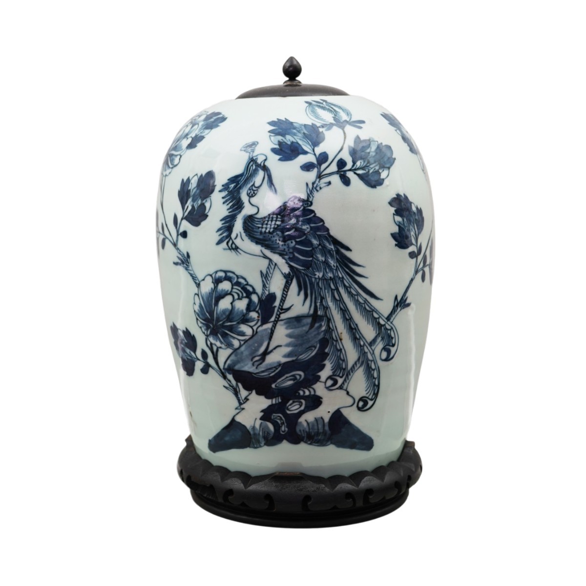 Of good scale. The plain ovoid body with lovely pale green translucent celadon ground glaze. Traditionally decorated on one side in cobalt blue with a phoenix perched on a stand surrounded by peony stalks and flowers.