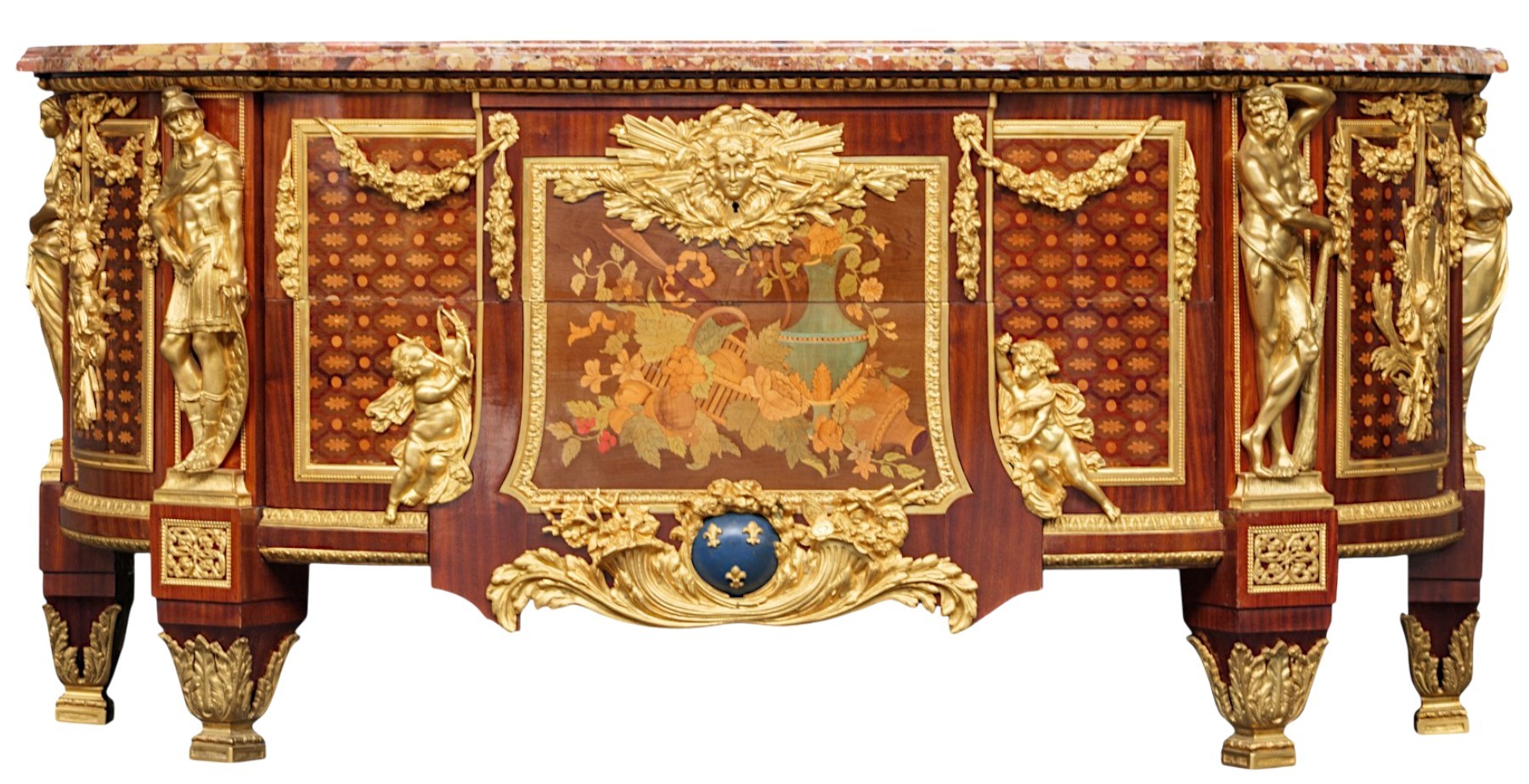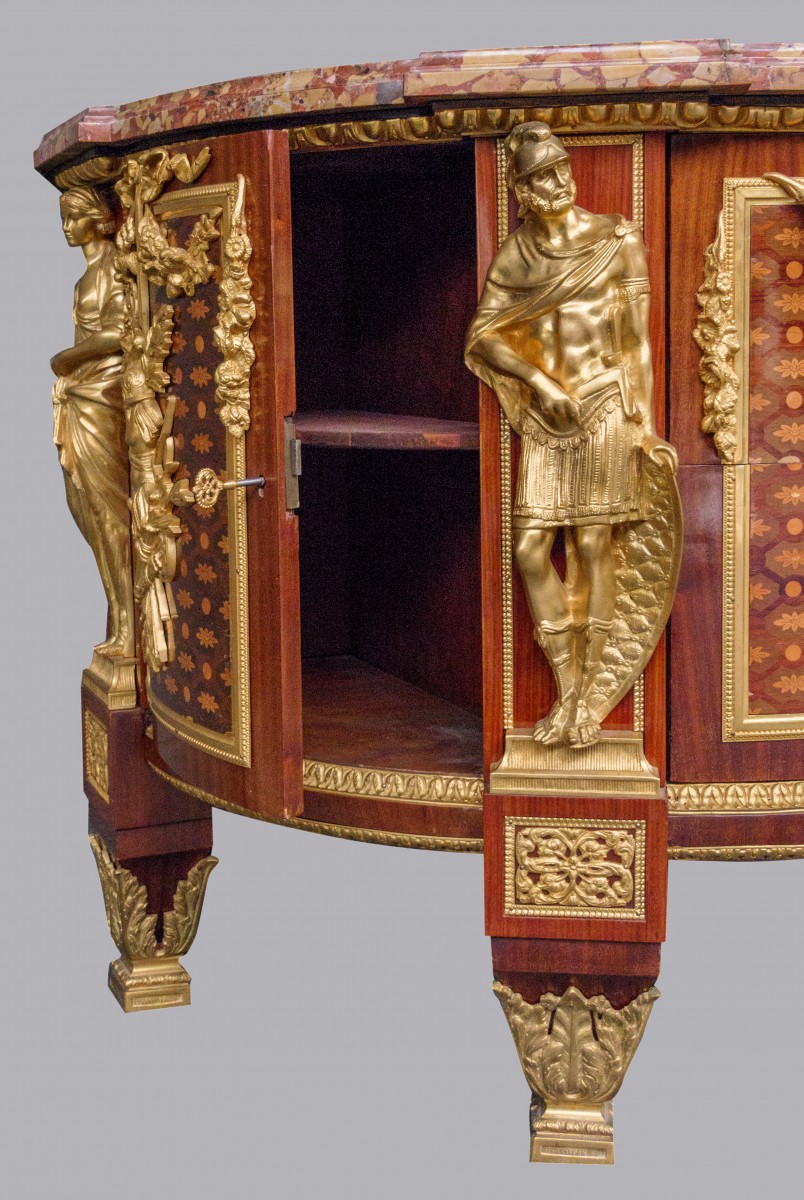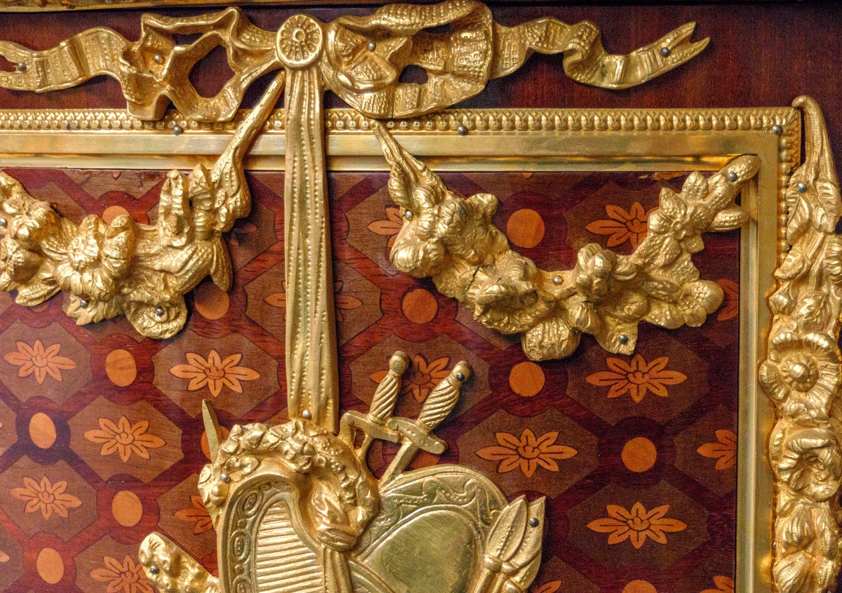 Exceptional commode “AUX GUERRIERS” late 19th century. This chest of drawers is made after the 1775 model of the great cabinetmaker Riesener for Louis XVI’s bedroom in Versailles. In marquetry of amaranth and colored wood, mounted with gilded bronzes. It presents two large drawers with a hidden support crossbeam centered by a large panel of marquetry of flowers and ewer in a frame of trellis, foliated garlands and cherubs in chased and gilded bronzes. The side leaves, also inlaid with trelliswork, are placed under imposing military trophies in gilded bronze. The angles are decorated with four mythological figures: “Prudence” (wisdom) and “Temperance”(moderation), “Mars”, holding a shield in one hand and a spear in the other, and “Hercules”, holding his club. On both sides of the body in the middle of the chest of drawers sit two children in bas-reliefs, one representing “Justice” and the other “Beneficence” (charity). The low belts are centered by a blue, fleur-de-lysed globe on a bed of acanthus leaves and leafy horns of plenty. A memoir by Riesener, dated 1777, allows us to affirm that a globe with fleurs-de-lys was indeed on the original piece of furniture. It rests on four large hoofed legs with acanthus base. Double molded Brèche d’Alep marble top.