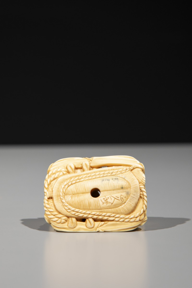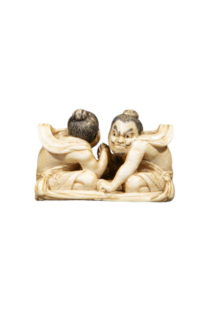 An ivory netsuke depicting Raijin and Fujin engaged in an arm-wrestling contest atop a large sandal. Their faces are finely carved with intense expressions; the hairstyles and drapery are rendered with precision and attention to detail.