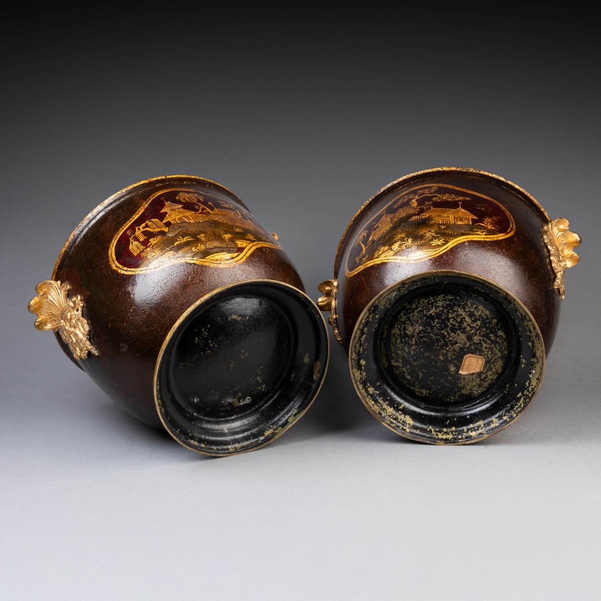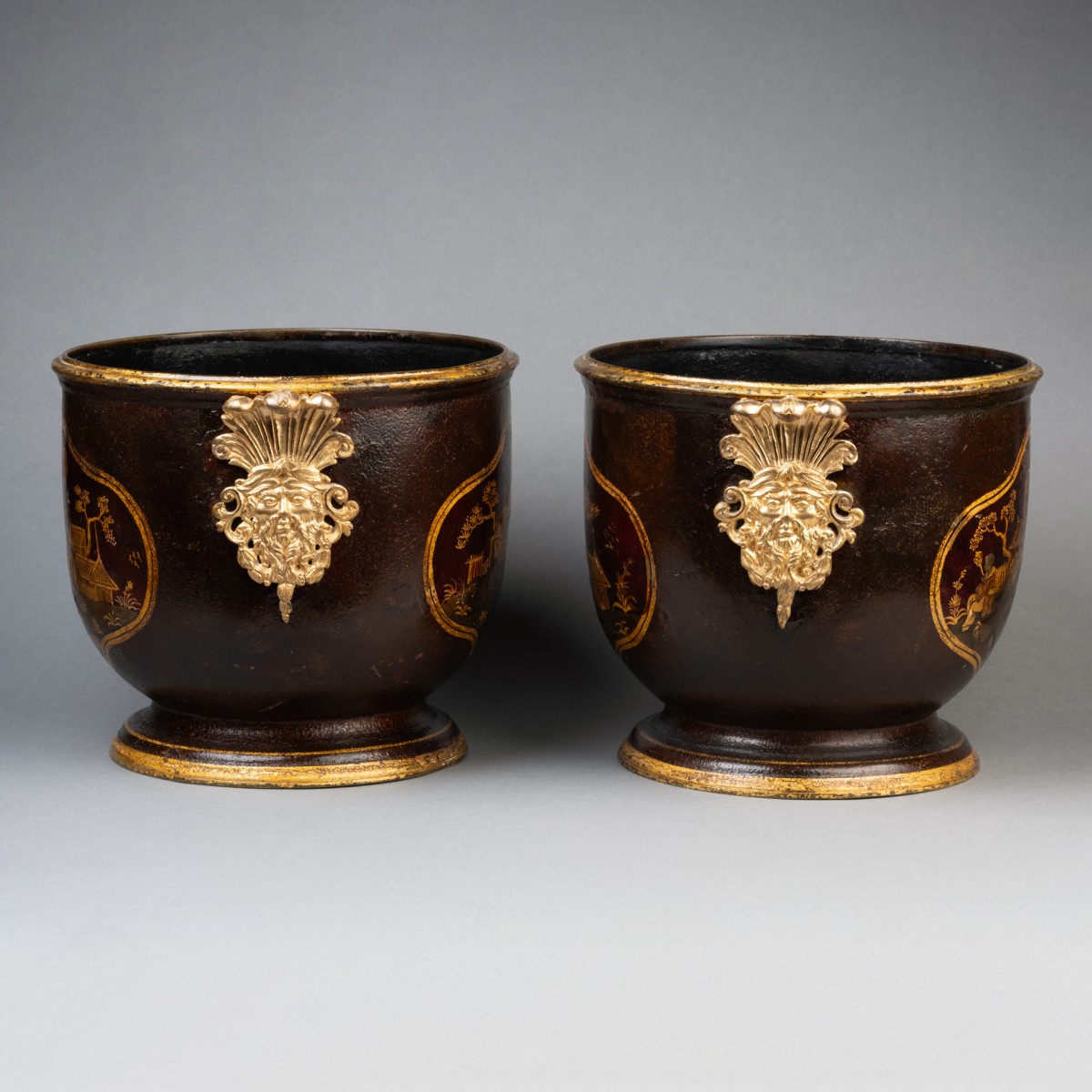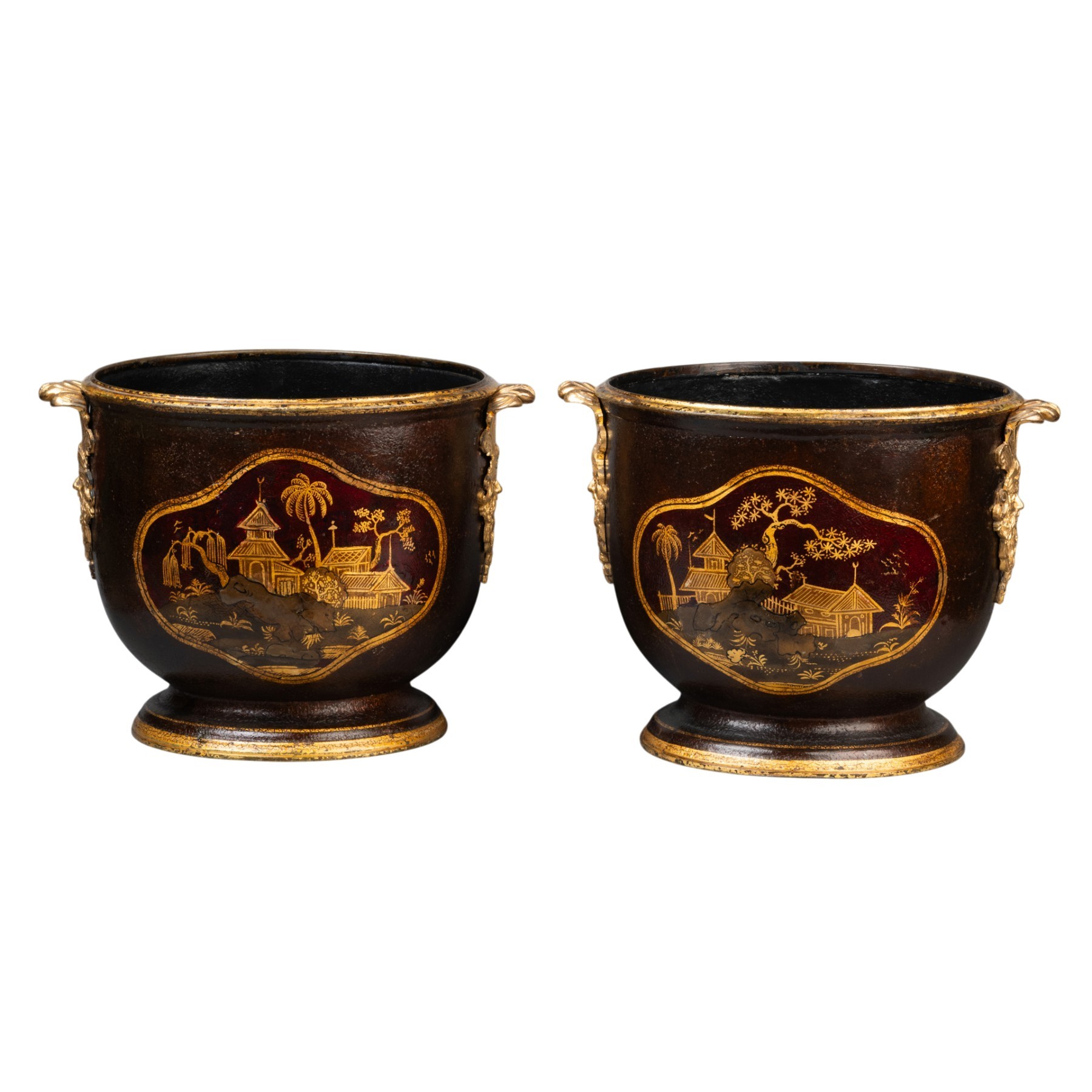 Pair of cooling buckets, made of black lacquered sheet metal, decorated with Chinese-style landscapes and pagodas on an aventurine background, set within cartouches.