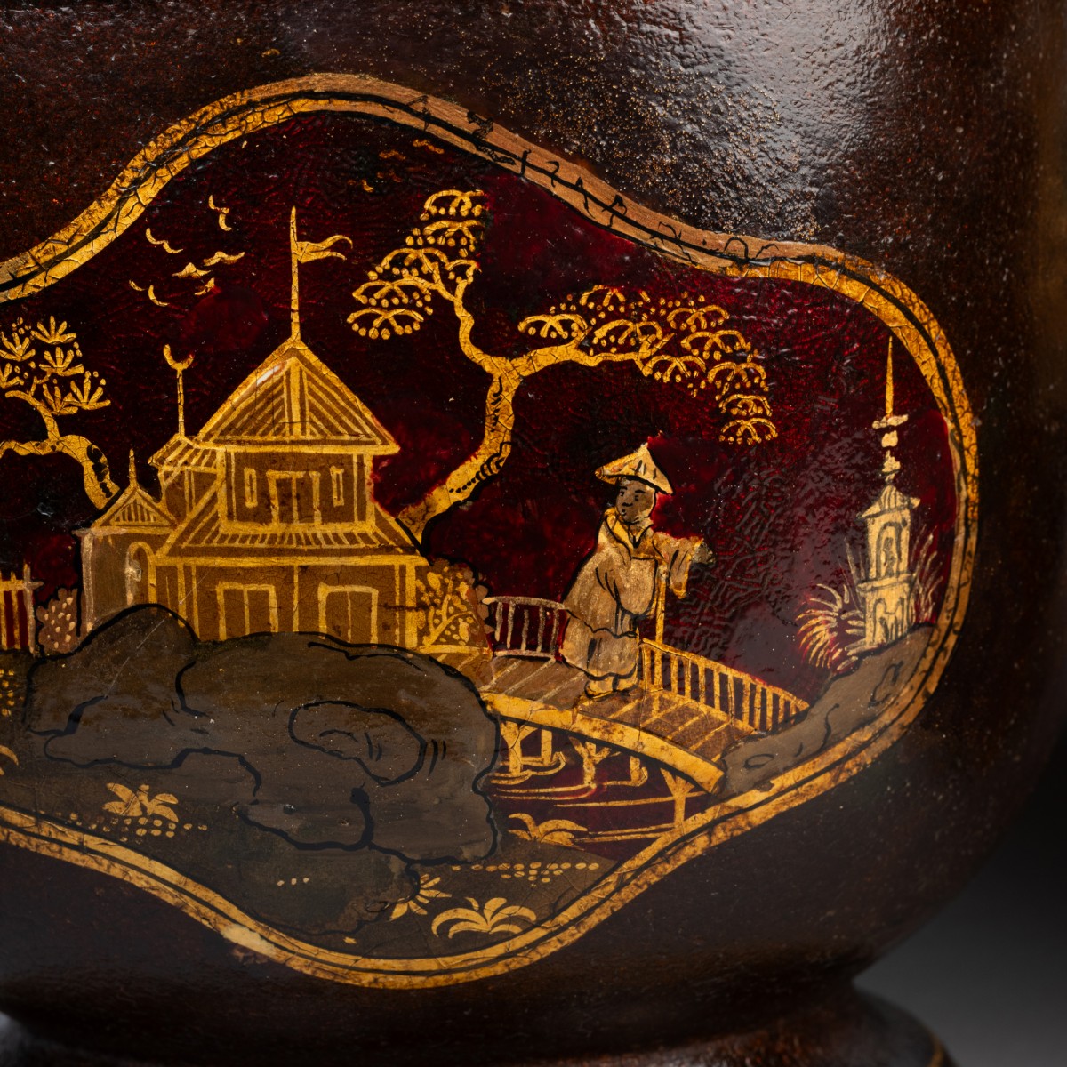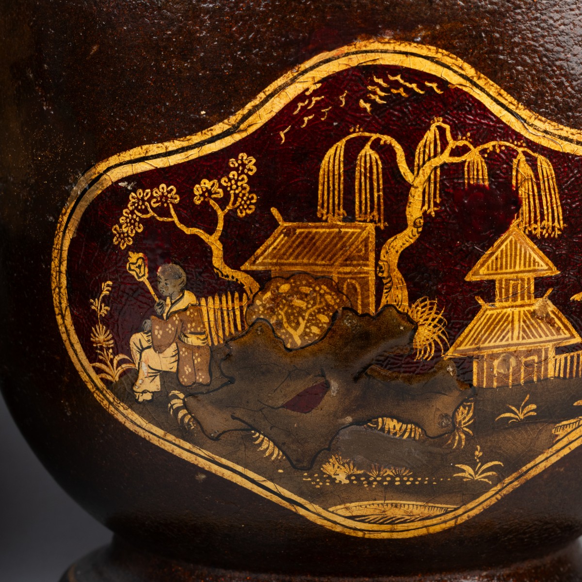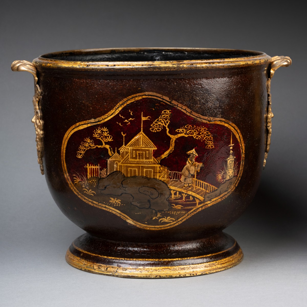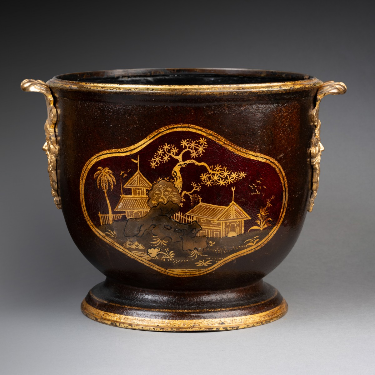 Pair of cooling buckets, made of black lacquered sheet metal, decorated with Chinese-style landscapes and pagodas on an aventurine background, set within cartouches.