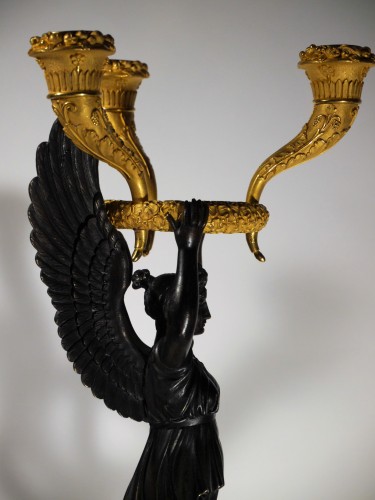 Great pair of candelabra with winged victories in patinated bronze and gilt bronze, Empire period. Ancient style caryatids support a crown on which are fixed three horns of plenty. Thomire delivers an identical pair (whose base is different) to the Bavarian Court around 1810. An similar pair to our piece was delivered in 1816 to Garde Meuble by Choiselat. This pair will be placed at the Château de Rambouillet until 1831 and at the Tuileries in 1833.