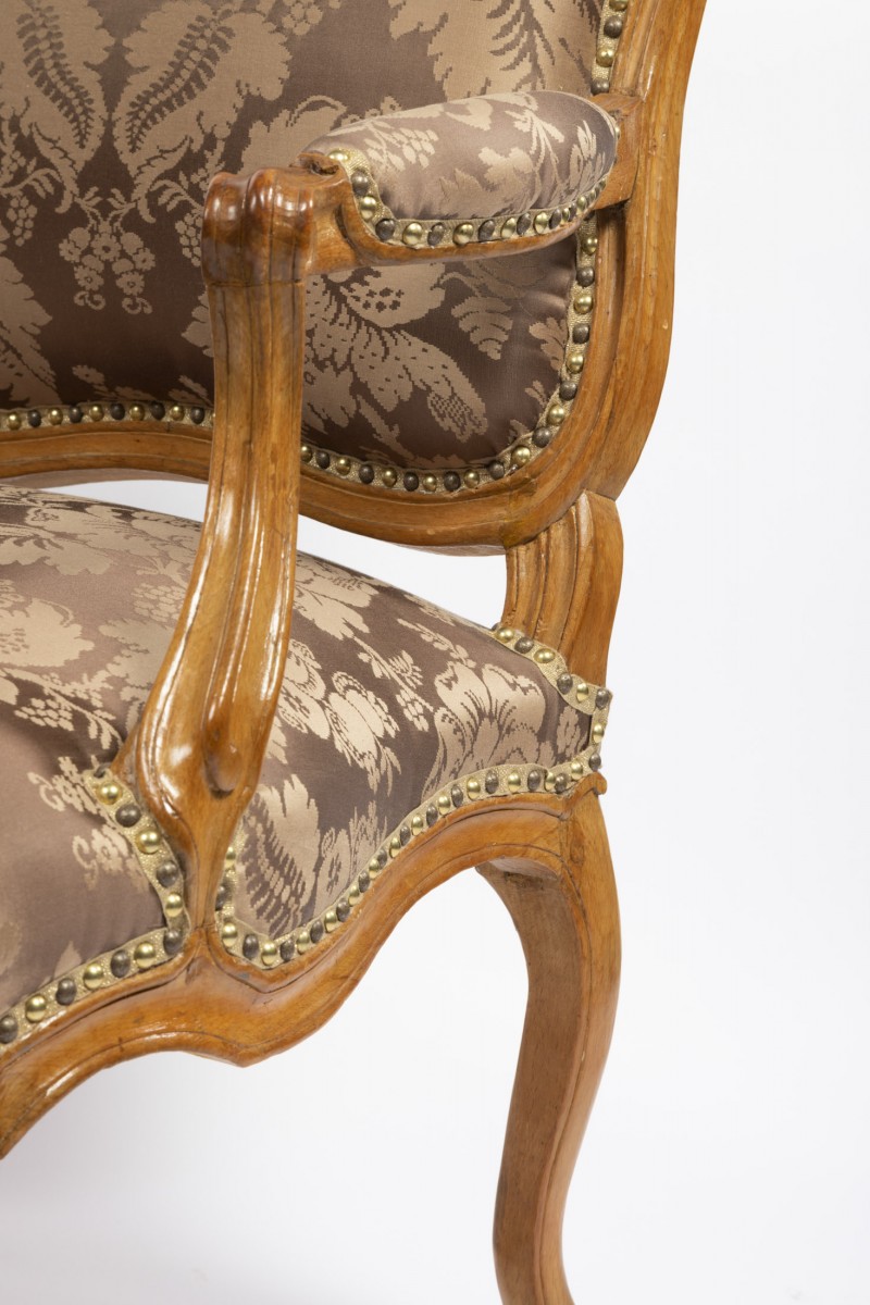 A st of four " queen's " armchairs in natural beechwood molded and carved with acanthus leaves and flowers resting on arched feet with damped flowers .