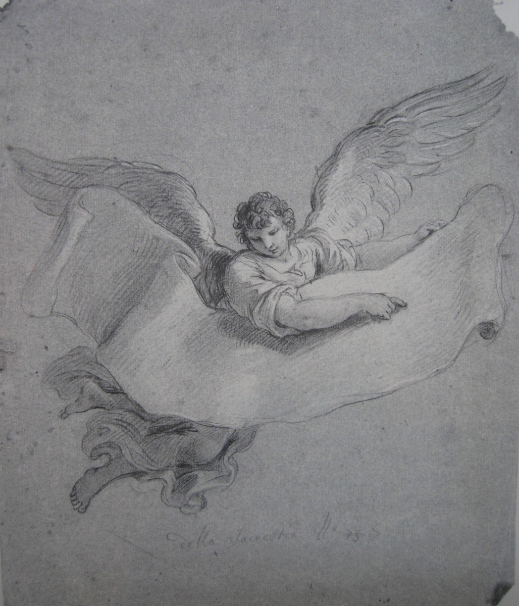 Like the comparable sheet kept in the Clark collection, this angel is related to the ephemeral decor made in Saint Peter of Rome on the occasion of the canonization of Camille de Lellis, Catherine Ricci, Fidelis Sigmaringen, Giuseppe da Leonessa, and Pedro Regalado. The ceremony took place in St. Peter's on June 29, 1746. Most of the most important painters in Rome, such as Subleyras, Trevisani, and Costanzi, collaborated in the decoration under the direction of Luigi Vanvitelli.