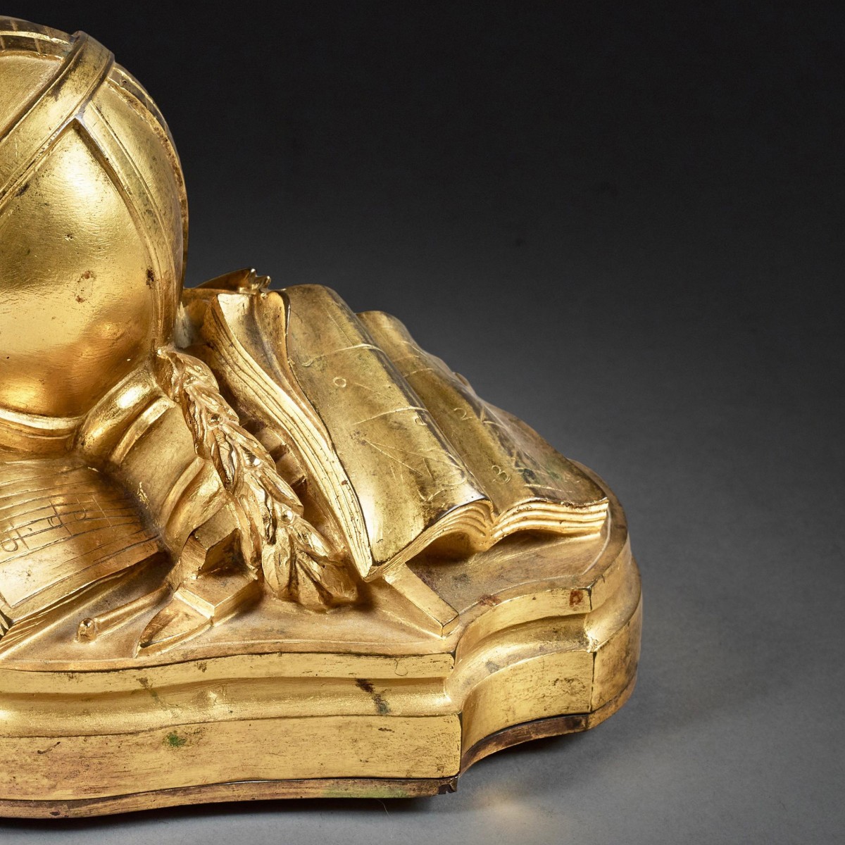 Intended to prevent the papers to fly, the paperweight was destined to be placed on the flat desks as well as the inkstands and the inkhorns. They offered to the artists the occasion to develop authentic sculptures which weight responded also to the practical requirements of this object. Following the evolution of the shapes just like here with a base which movement announces the developed forms under Louis XVI, it depicts subjects in vogue (dogs, children…) or a link with the taste of the commissioners. This paperweight of allegorical theme thus associates to a set of attributes evoking the science such as a palette, attribute of painting, a column base attribute of architecture, a sheet of music, attribute of music, to instruments of geometry, attributes of this subject, as well as a celestial globe and books to represent science.