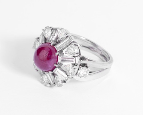 Platinum ring set in its center with a cabochon ruby ??(1.5 carats) and TA and baguette diamonds (approximately 3 carats) Finger size: 52 Weight: 10.9 grs from the 1980s