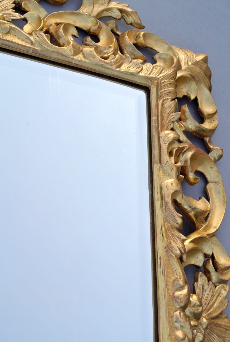 Mirror with pediment in gilded wood carved with foliage and openwork windings. Mid-19th century period (Napoleon III). Original beveled ice (tin with silver nitrate), beautiful gold leaf gilding also original giving it a lot of elegance.
