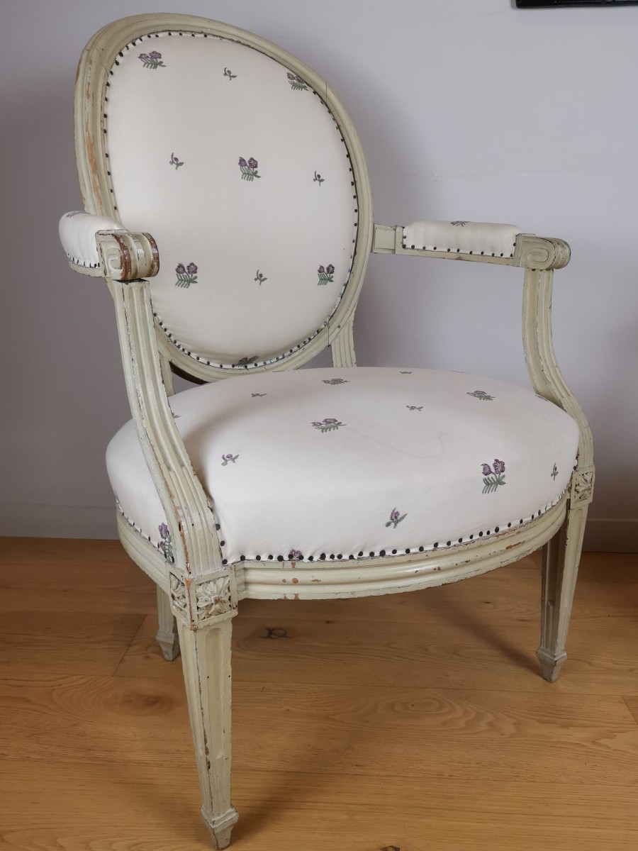 Pair of molded, Pair of molded, carved and lacquered neoclassical cabriolet armchairs called Greek Louis XVI period, modeled by Pierre Pillot. Beautiful woodwork; wide back curved in medallion, armrests with very flared cuffs resting on consoles forming part of the belt by their locations directly above the forefoot by connecting dice. Each of these dice is carved with clover foliage in strong relief unifying the belt with the base consisting of four feet. All are sheathed, choked at the top and pinched on a square section base. Each of them is carved with a unique deep rudent groove. All of the woodwork is harmoniously highlighted with fine flat moldings. The set of extreme finesse without the slightest superfluity is sufficient on its own. Balance, nervousness, elegance and quality are the most appropriate terms for this very beautiful pair of seats. It should be noted the great care taken to the connecting elements of an irreproachable quality. The upholstery and upholstery are in good condition; only the slightly stained cover should eventually be repaired. Dimensions H 94.3cm, seat h 44.5cm, L 62.5cm, P 53.6cm (at the belt). A chair created by the hand of the most famous master cabinetmaker from Nîmes is recognizable at a glance. All the ornamental repertoire of neoclassical inspiration said to the strongly architectured Greek, up to the atypical base so representative of the master are represented there. Here, the base is not spindle as usual with its contemporaries but treated in progressive square sections called sheath; each side is wound up with a single large and deep rudent groove. The work of sculpture of a decoration of moldings of the armrest hands are not treated in converging ellipses at the end of these as usual but on the totality of the said hand, thereby amplifying the decoration . All its details combined with the attested facts that Pillot did not stamp all his production in favor of a promotional label for his workshop in the style of the Hache Grenoblois; converge on the attribution of these seats to the Nîmes master. Observations: Good state of conservation, woodwork without grafts or joints. Pierre Nicolas Pillot, born in Fontenay in 1748 and died in Nîmes in 1822, is a carpenter active in Nîmes at the end of the 18th century and at the beginning of the 19th century. At thirteen, Pierre Pillot was apprenticed to Mathieu Bauve for a period of six years. He works with this Parisian master probably nine years as a companion. He graduated in 1780. His workshop was located in the Prat district on Île du Collège. Because of his training in the Parisian community Pillot stamped part of his production. Pillot stamped part of his production. His training in the Parisian community undoubtedly explains this practice. Henri Vial reports, in his work published in 1912, the existence of a label discovered on a late Louis XVI console. This label, torn in two places and incomplete, stated “Pillot, a master carpenter sells all kinds of furniture, English-style armchairs, in medallions […] as in upholstery, Turkish beds, ottoman, all-in-one sofa [ …] Than in my […] chests of drawers, Greek-style tables […] at a fair price […] Nismes near market N ° 106 ”. In smaller letters was indicated "[...] to make on the spot those which will be ordered to him".