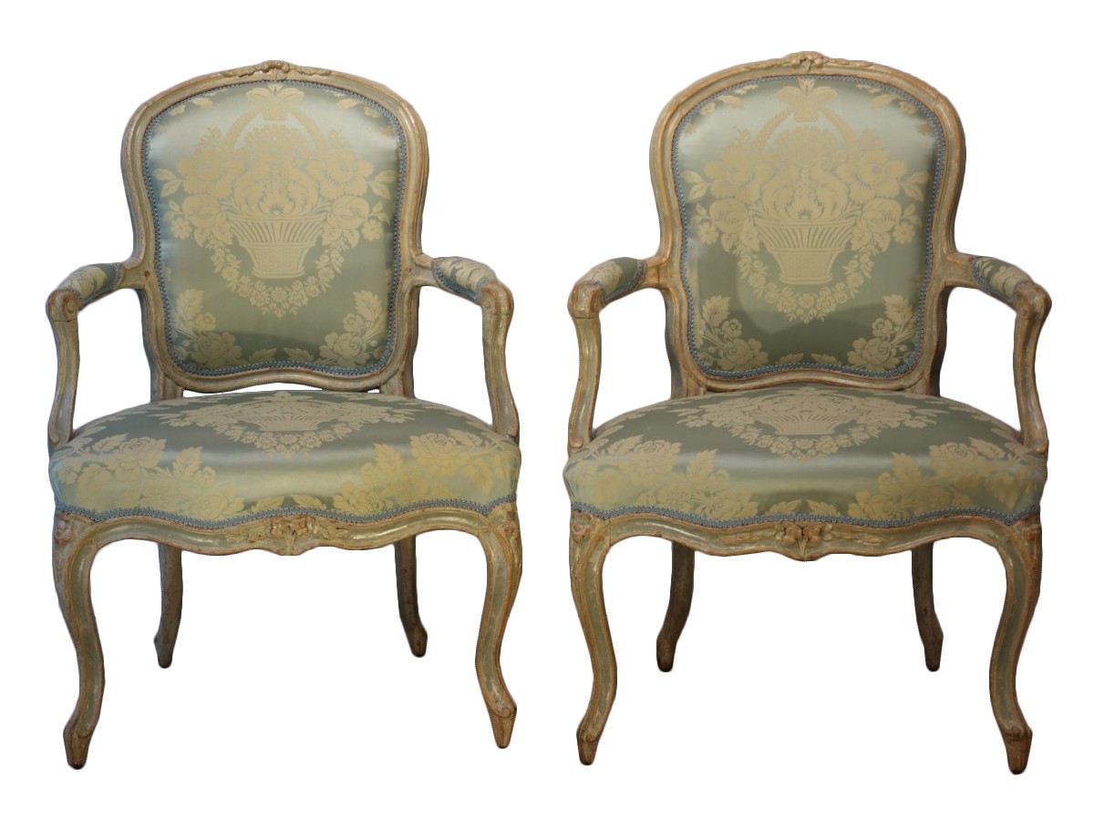 Our pair of armchairs is covered with a beautiful silk in perfect condition, in tones matching the lacquer.