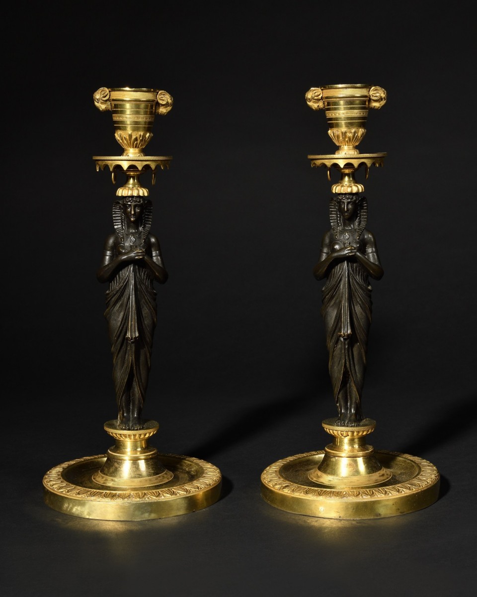 The decorative repertoire of this pair of candlesticks is typical of the Bergenfeldt manufacture. Indeed, the bronzier produced candelabra models with busts of Egyptian women quite similar to those, this time represented in full-length, of our candleholders. Moreover, we find in his production, exactly the same binnacles, decorated with heads of goats or lions.